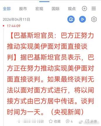 紧接着,央视新闻:巴基斯坦官员称,巴方正努力推动实现美伊面对面直接谈判——若无法实现面对面会谈,将由巴方居中进行间接沟通,谈判时长计划为一天