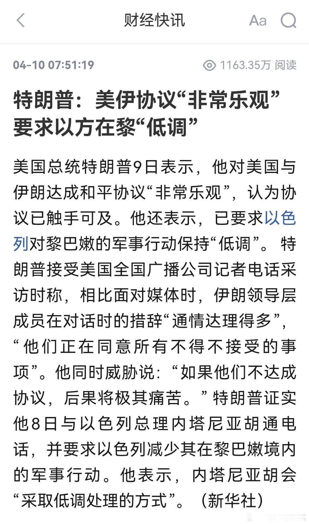 特朗普9日表示,他对美国与伊朗达成和平协议“非常乐观”,认为协议已触手可及;已要求以色列对黎巴嫩的军事行动保持“低调”