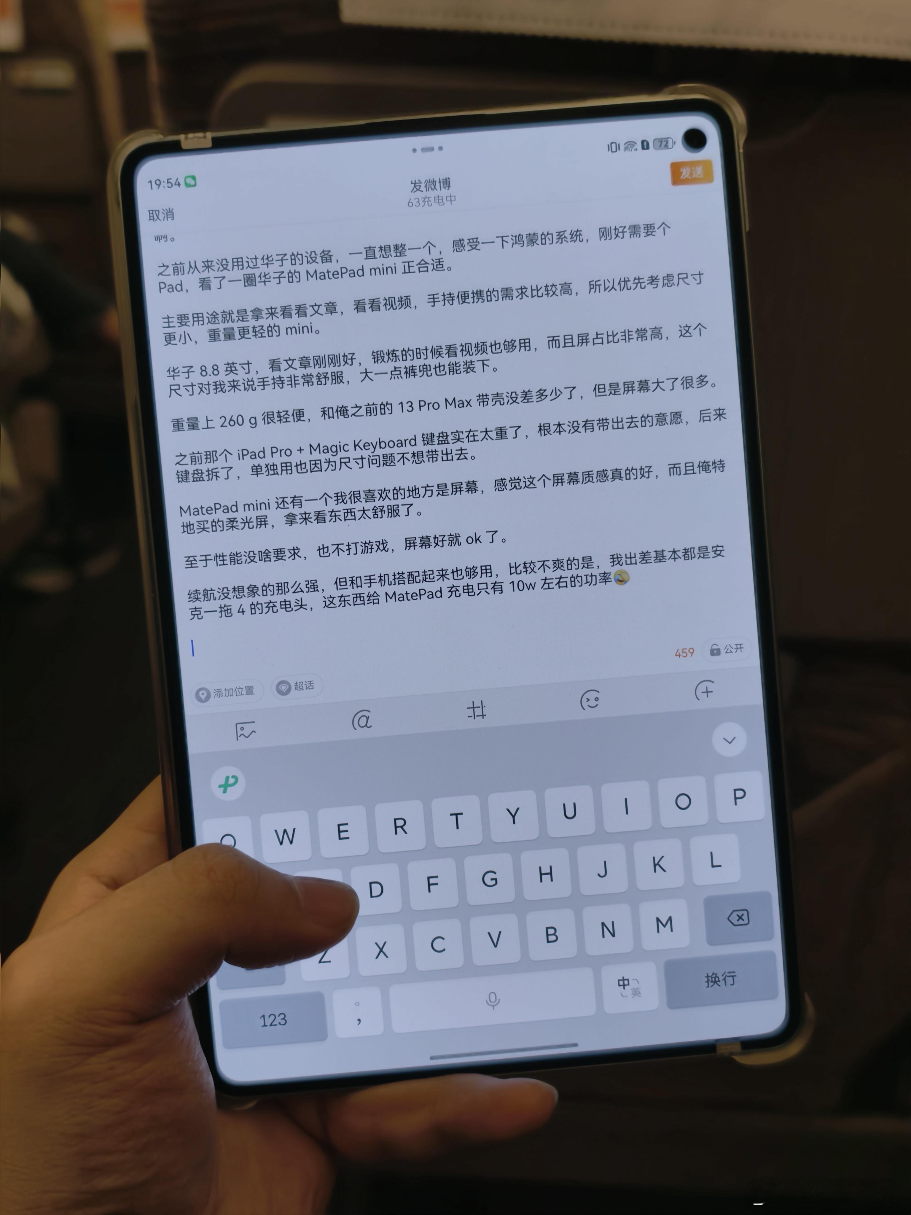 华子的这个 mini 8.8 英寸,看文章刚刚好,锻炼的时候看视频也够用,而且屏占比非常高,这个尺寸对我来说手持非常舒服,打字很顺手,带出门大一点的裤兜也能装下。