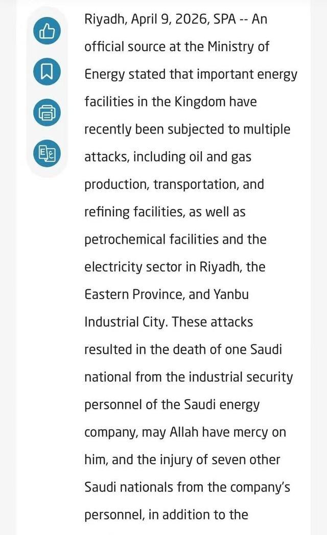 伊朗革命卫队在停火协议达成后不久发出声明,明确表示停火期间没有对任何阿拉伯国家发动袭击,并把其他地方出现的爆炸归为无关方所为。沙特能源部随后公布消息,两处石油生产设施遭遇袭击,具体是马尼法和胡赖斯油田区域,这直接造成沙特每日原油生产能力减少约60万桶。其中马尼法设施损失约30万桶,胡赖斯此前已受影响,再加上这次总计达到这个数字。