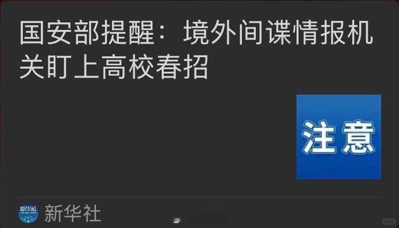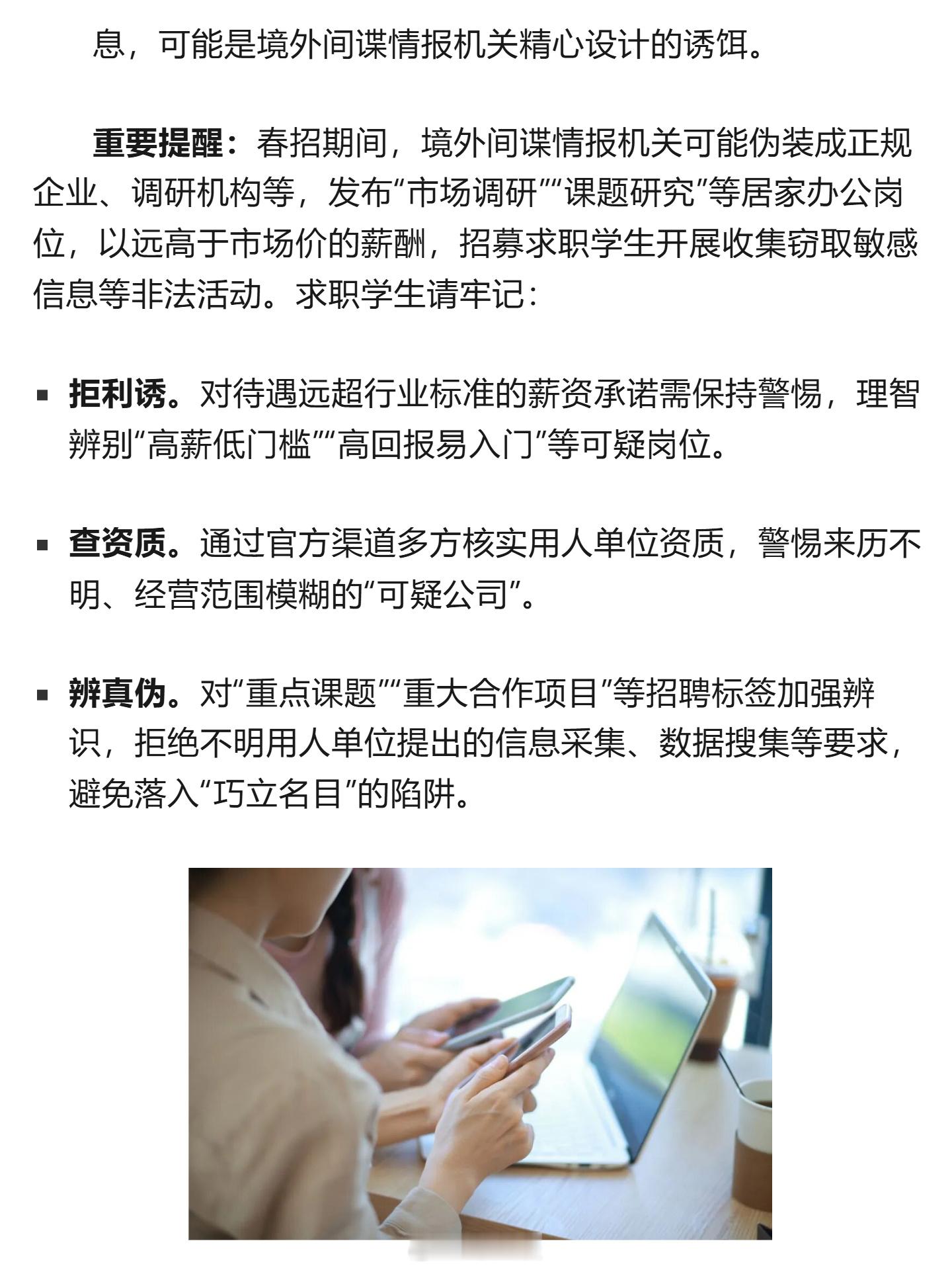 国安部提醒:境外间谍情报机关盯上高校春招。境外间谍情报机糖霜陷阱越来越有针对性,