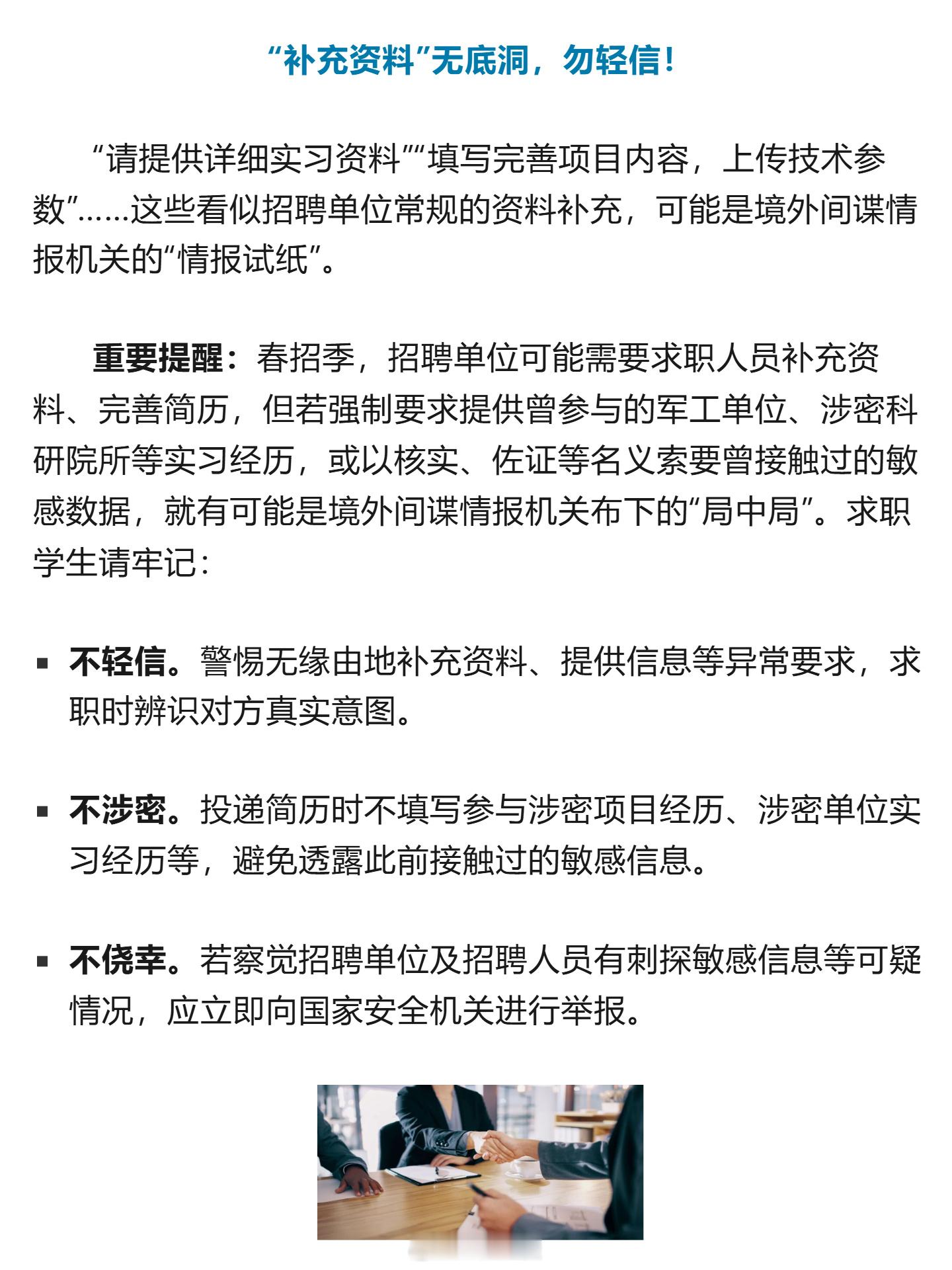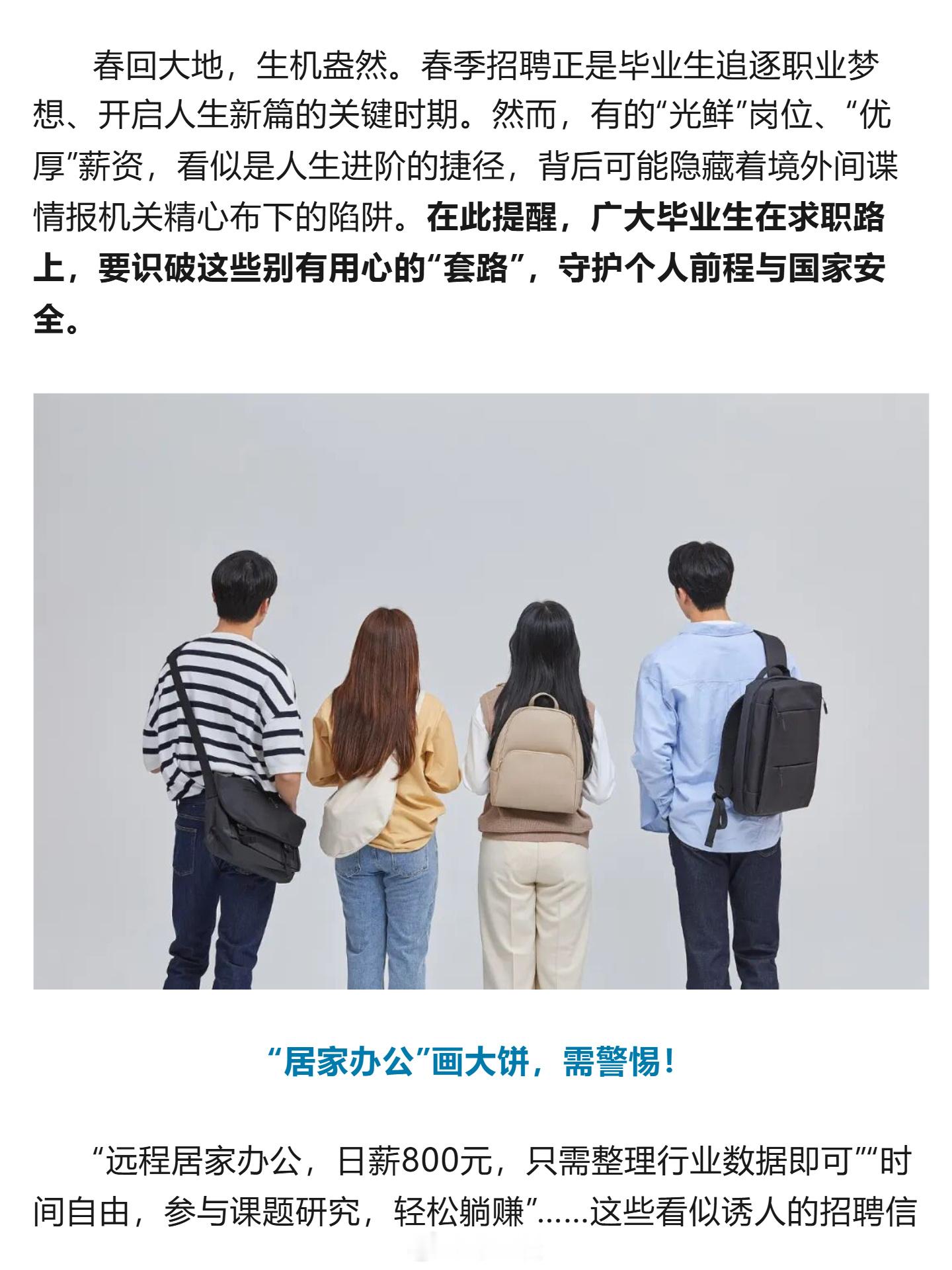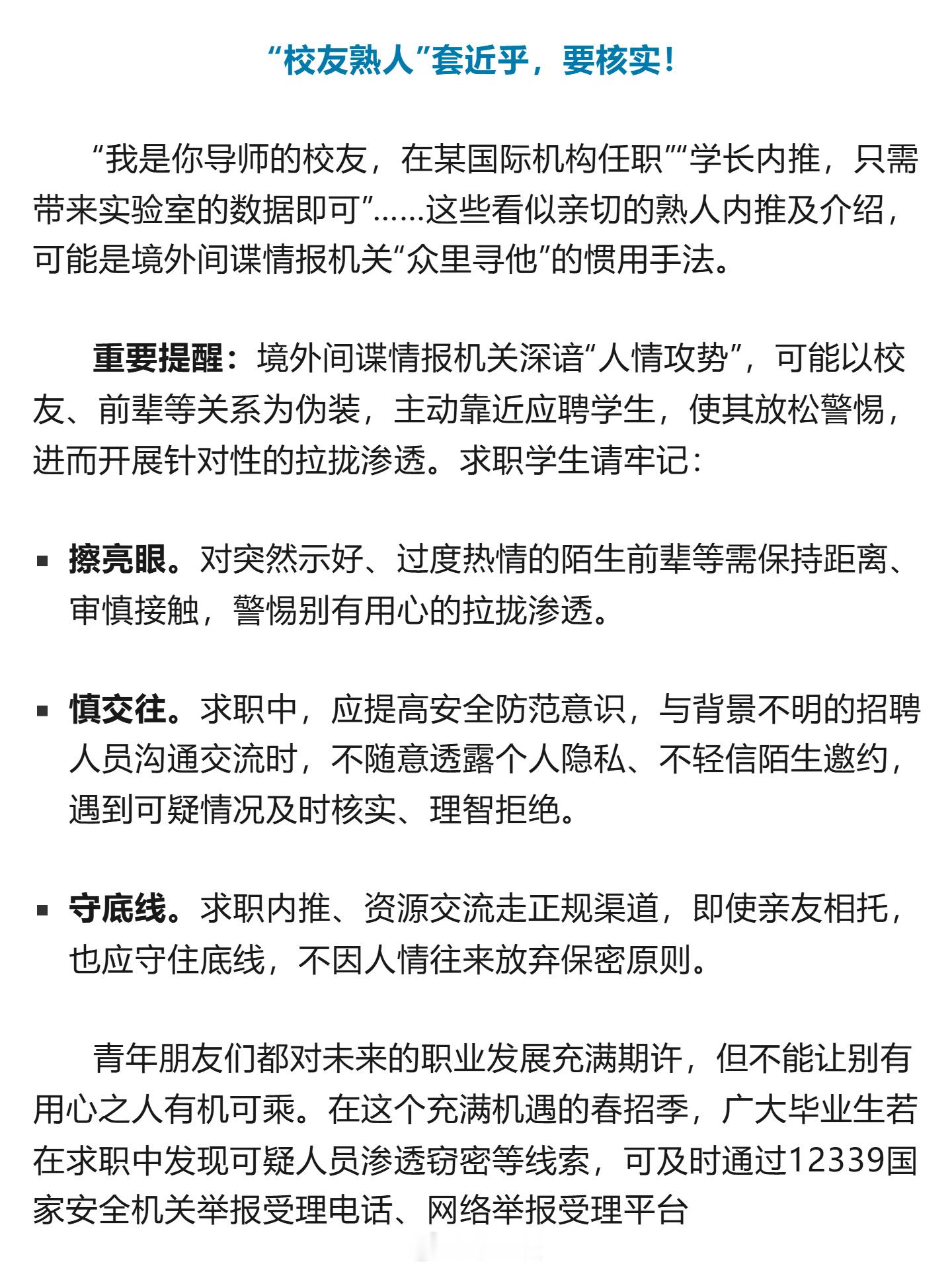 国安部提醒:境外间谍情报机关盯上高校春招。境外间谍情报机糖霜陷阱越来越有针对性,提醒广大毕业生,在求职路上,要对这些别有用心的“套路”多个心眼,既是为守护国家安全,也是为了个人前程。