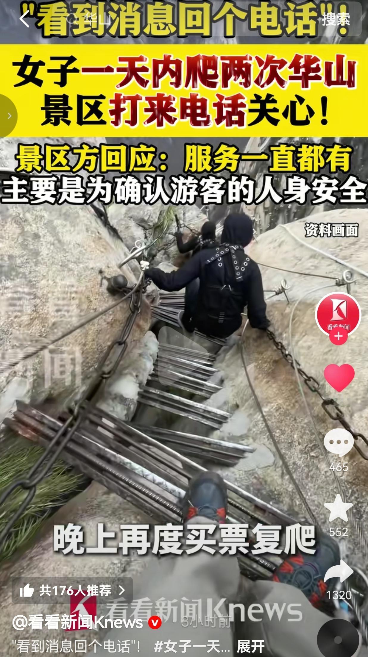 真的看哭了!现在还有这么细心的景区,真的太难得了!就因为姑娘一天之内连爬两次华山,人家景区直接打电话过来关心,就这一下,真的暖到骨子里了!