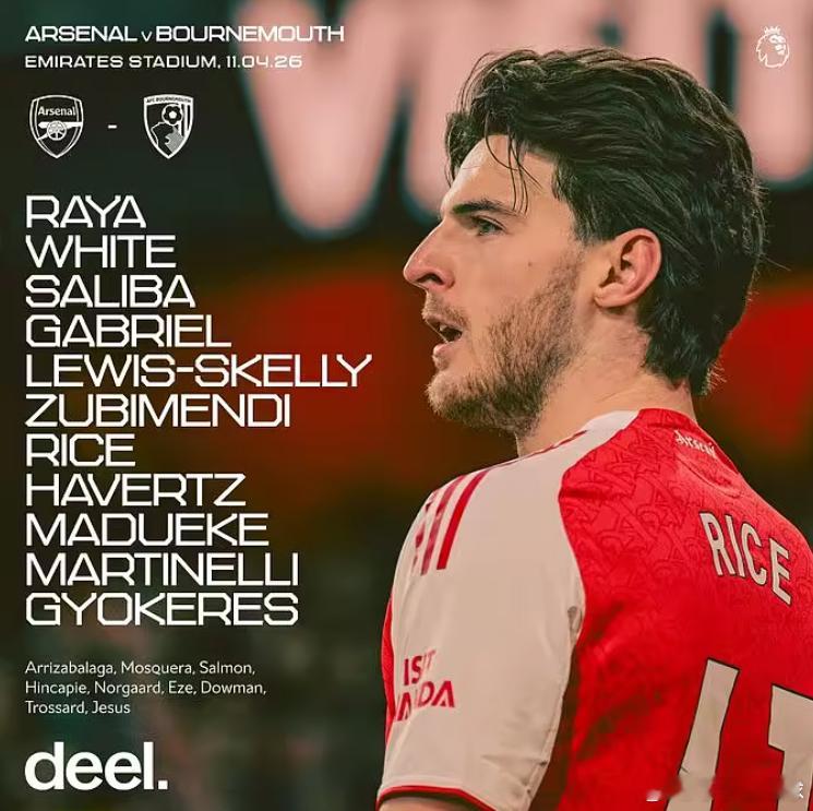阿森纳首发:1-拉亚、4-怀特、6-加布里埃尔、2-萨利巴、49-斯凯利、41-赖斯、36-苏比门迪、20-马杜埃凯、14-哲凯赖什、29-哈弗茨、11-马丁内利