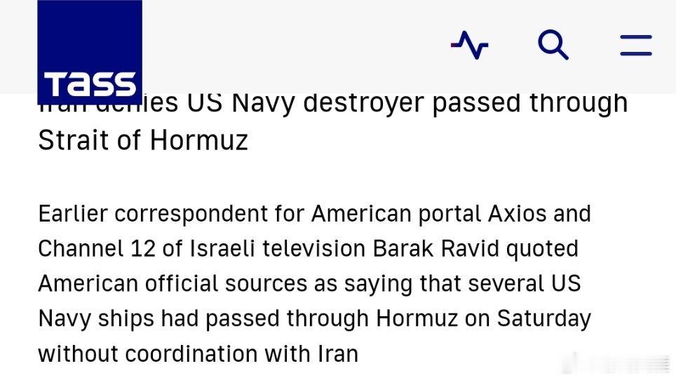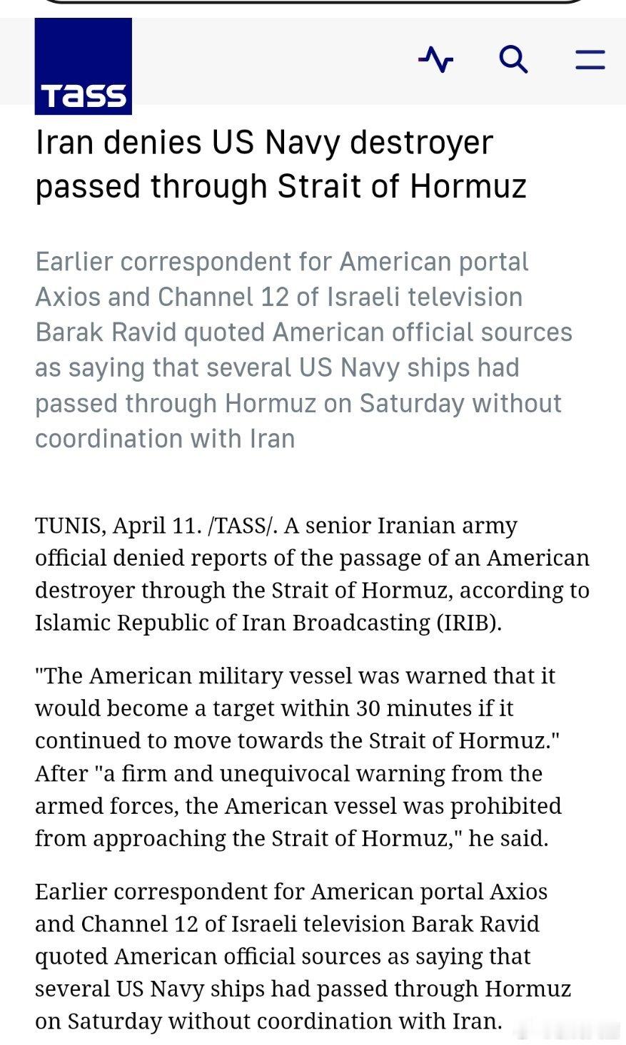 4 月 11 日。/塔斯社/。据伊朗伊斯兰共和国广播电台(IRIB)报道,一名伊朗高级军方官员否认了有关一艘美国驱逐舰通过霍尔木兹海峡的报道。