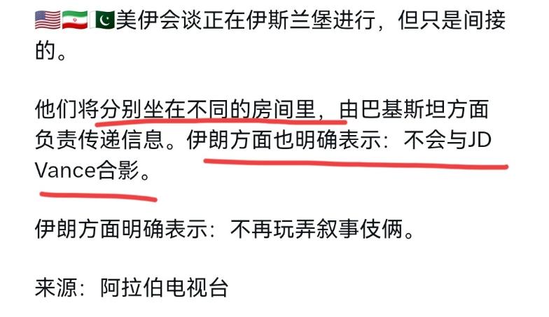 4月10日,根据外媒报道,外媒称,美国与伊朗在伊斯兰堡举行会谈,但谈判仅为间接谈判。因为双方将分处不同房间,由巴方人员往返传递信息。伊朗方面还明确表示:拒绝与万斯同框合影。伊朗强调:不接受任何舆论操弄把戏。