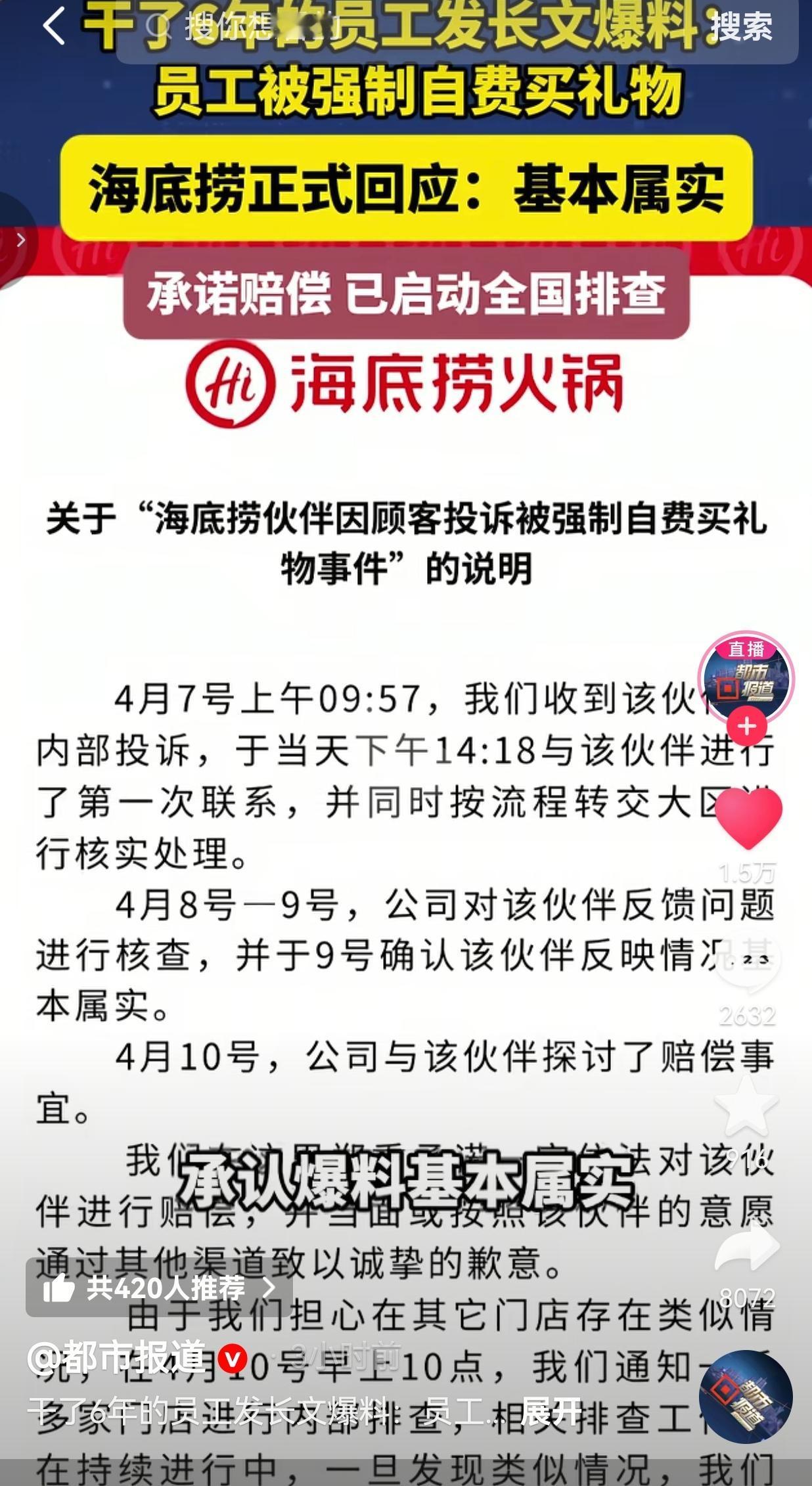 更离谱的是,4月11日海底捞官方直接发声明回应:员工反映的情况基本属实!