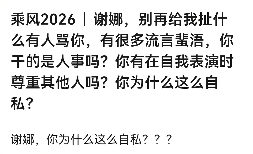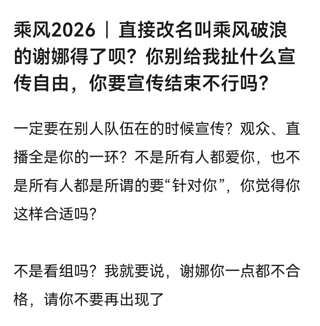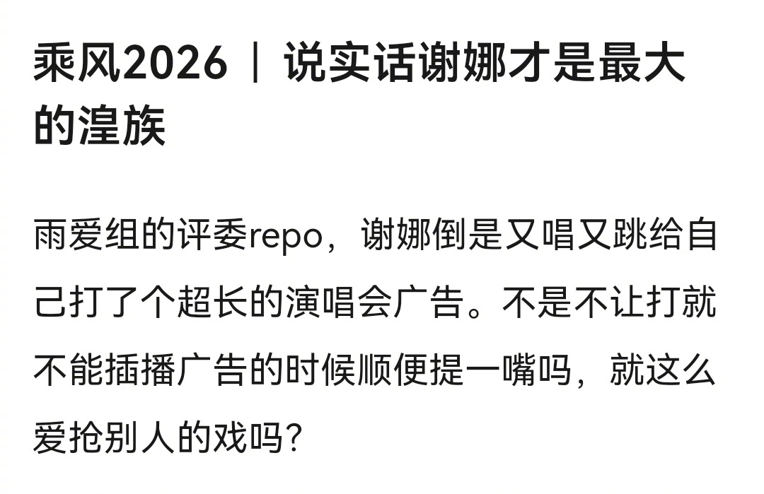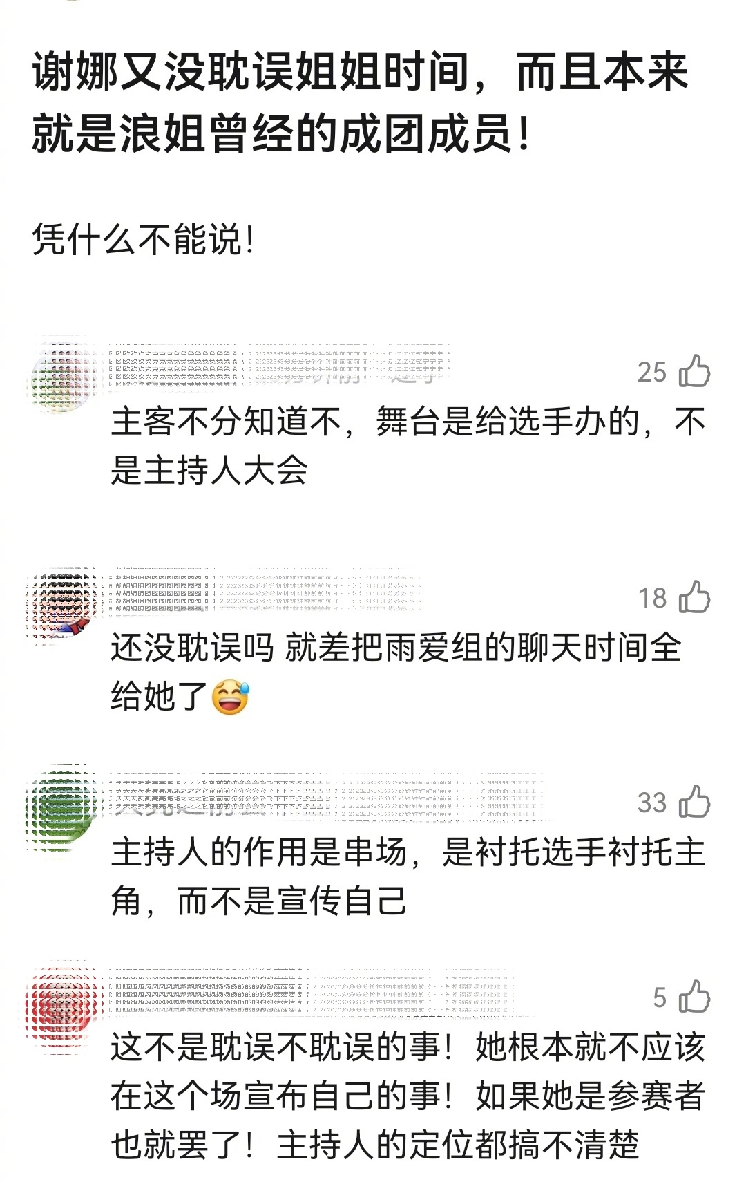 谢娜在乘风舞台官宣要开演唱会引争议。她的定位是乘风见证人,属于节目辅助、陪伴类的角色,连主持人都不算,结果把姐姐们的场子搞成自己演唱会宣发地,网友吐槽太喧宾夺主,有点抢戏了