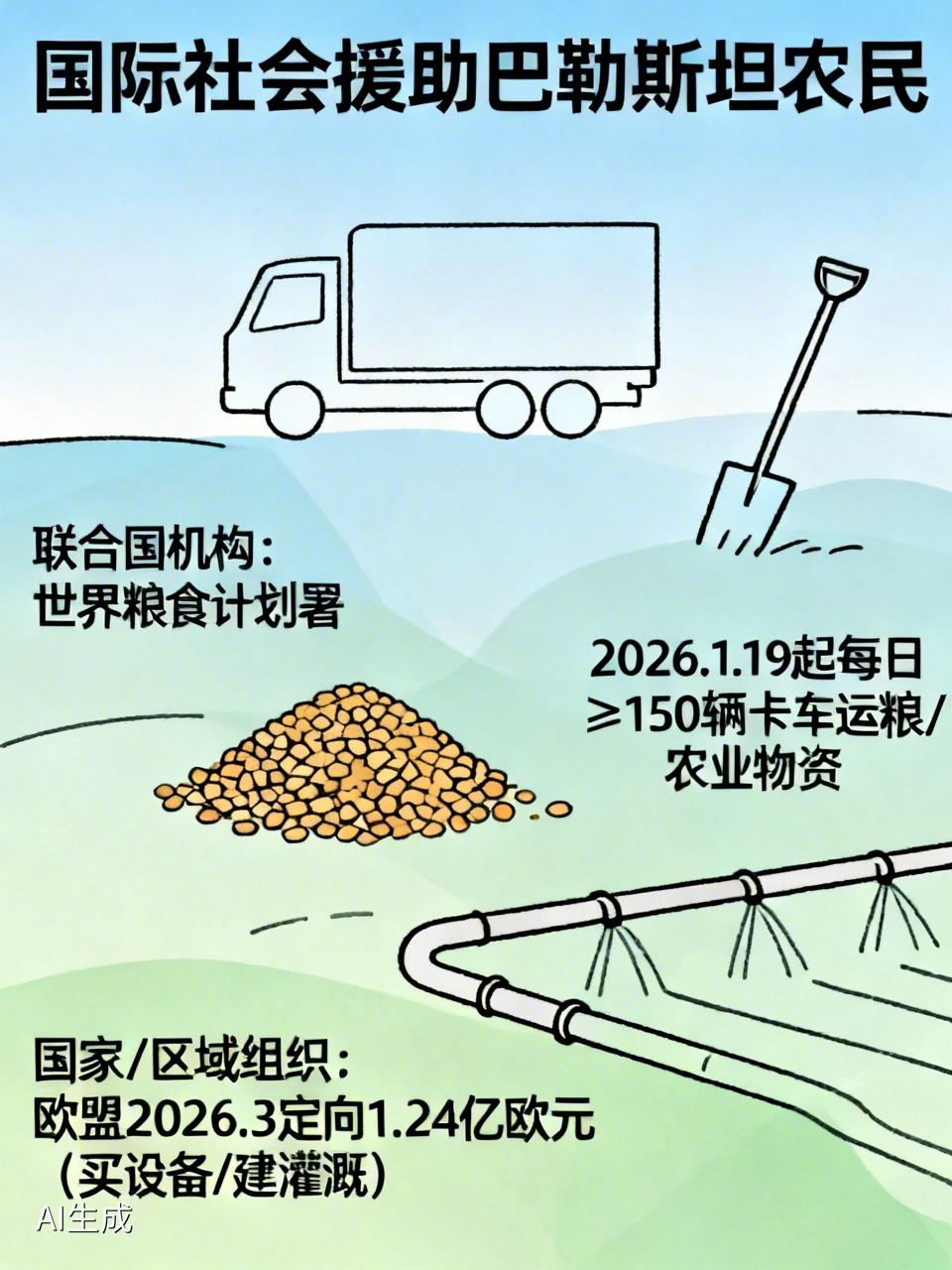 这个是当下整个巴勒斯坦急待解决的问题,是援助巴勒斯坦重要的组成部分,国际社会应该加大支持力度,在联合国相关部门组织下,针对巴勒斯坦农民的实际需要,提供相关种子、化肥、机具,尤其是针对巴勒斯坦缺水,解决农村种粮食需要的水源问题是当务之急,欧盟在2026年3月出手相助上亿欧元,支援了巴勒斯坦解决上述问题的资金保证。