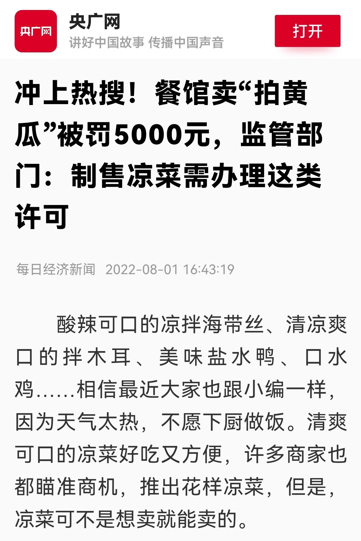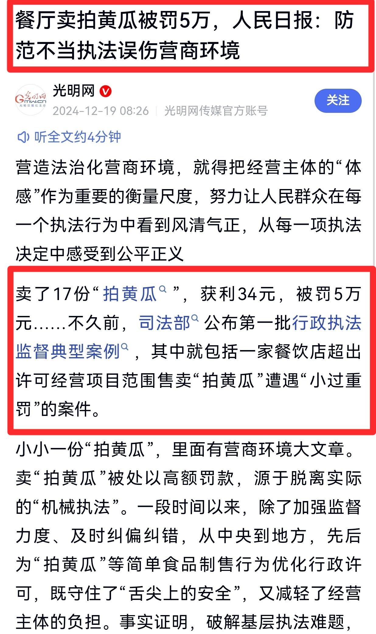 1、在2024年12月的司法部公布第一批行政执法监督典型案例中有过“餐厅卖拍黄瓜被罚5万,人民日报表示:防范不当执法误伤营商环境”;