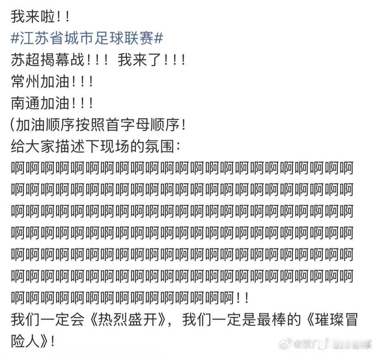 周深发了153个啊描述苏超氛围新一年的苏超又来了,没想到还是那么火,开幕式请来周深,这个价位听演唱会,只能说更火了!大投入,大影响,大规模,今年的江苏省城市足球联赛 只会更让人期待……还是那句话,谁赢谁输对于业余比赛真的不重要,今年世界杯年,全民参与快乐其中,让足球真正成为老百姓说起来都快乐的事,才是关键!鸣聊体育