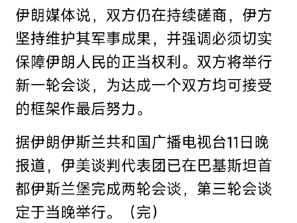 是不是可以把会谈总结为,美伊双方在进行着建设性的空谈,坦诚做好了再打的准备。截止目前,双方仍在持续磋商,霍尔木兹海峡是重点问题之一 按照特朗普这几天对于霍尔木兹海峡的发文和讲话立场,美国如果不能获得巨大的利益,达不到预期的目标,可能达成和平共识的协议并不容易。而且还有伊朗方面,他们坚持维护自己已经取得的军事成果,尝到甜头的伊朗也不可以轻易放弃目前拥有的主动权。伊朗同时还强调必须切实保障伊朗人民的正当权利。看来,谈判并不轻松,要达成双方都满意的结果,还需要继续努力。接下来,双方将举行新一轮的会谈,为达成一个双方均可接受的框架作出最后努力。让我们拭目以待吧!伊朗怒怼美国 霍尔布兹海峡 霍尔木兹危机 伊朗海峡危机 霍尔姆兹海峡 霍尔木海峡 封锁霍尔木兹