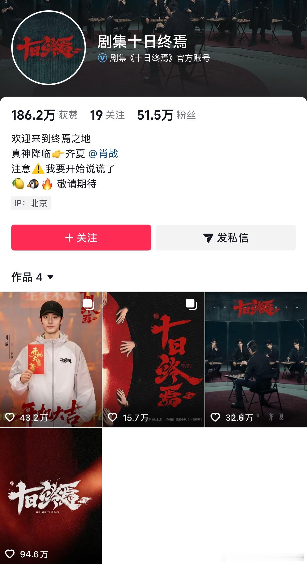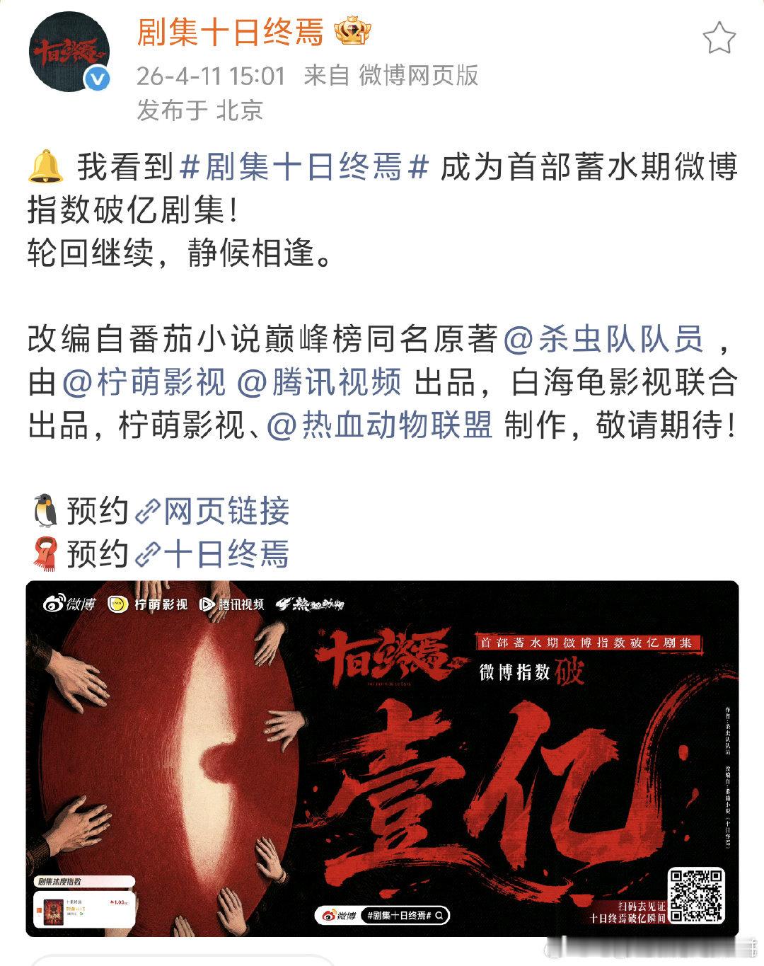 肖战十日终焉微指破亿 肖战《十日终焉》开机第三天已经达成两个破亿成就,分别是首部微博指数破亿剧集 vs 肖战齐夏官宣视频的播放量破亿,另外官抖概念片的点赞也即将破100w