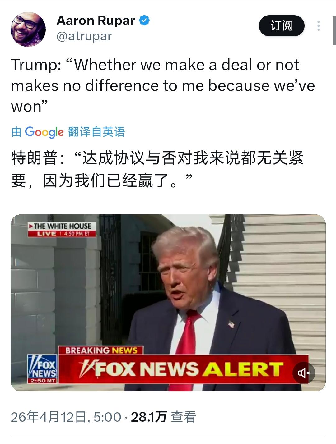 特朗普今天(北京时间4月12日)接受采访时表示:“达成协议与否对我来说都无关紧要,因为我们已经赢了。”