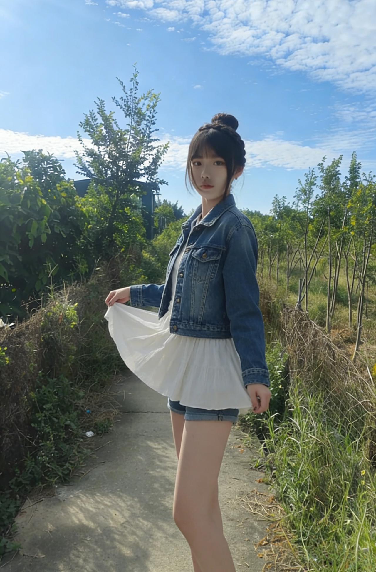 晴光铺野径,蓝白映青春。 立处风微动,眸中藏月轮。