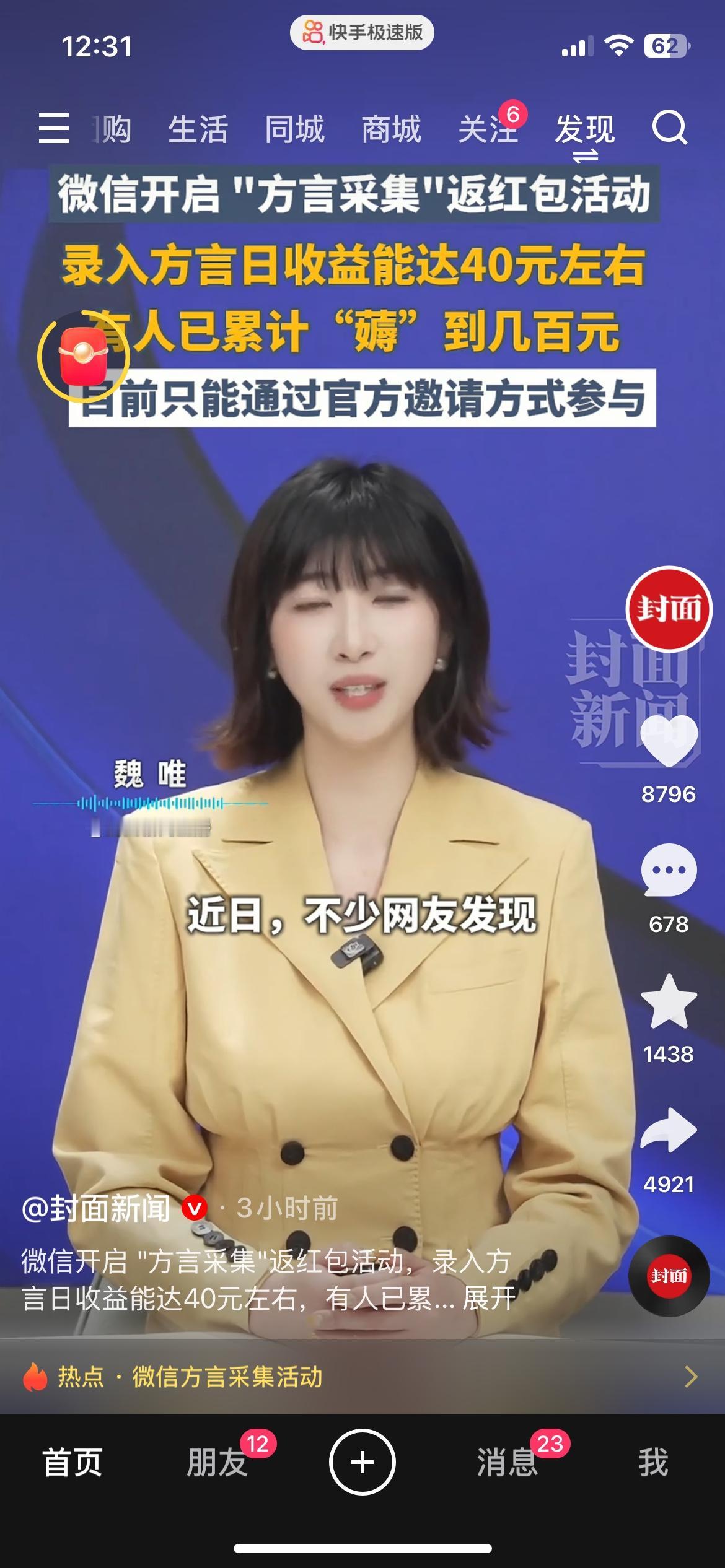 说白了是微信收集方言数据,优化AI语音识别,录得越多红包越多。有入口的话,闲着录两句赚零花钱没问题,但别指望靠这个发大财,也别点陌生链接,避免被骗。