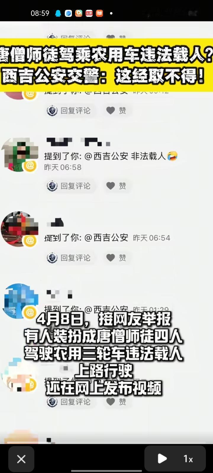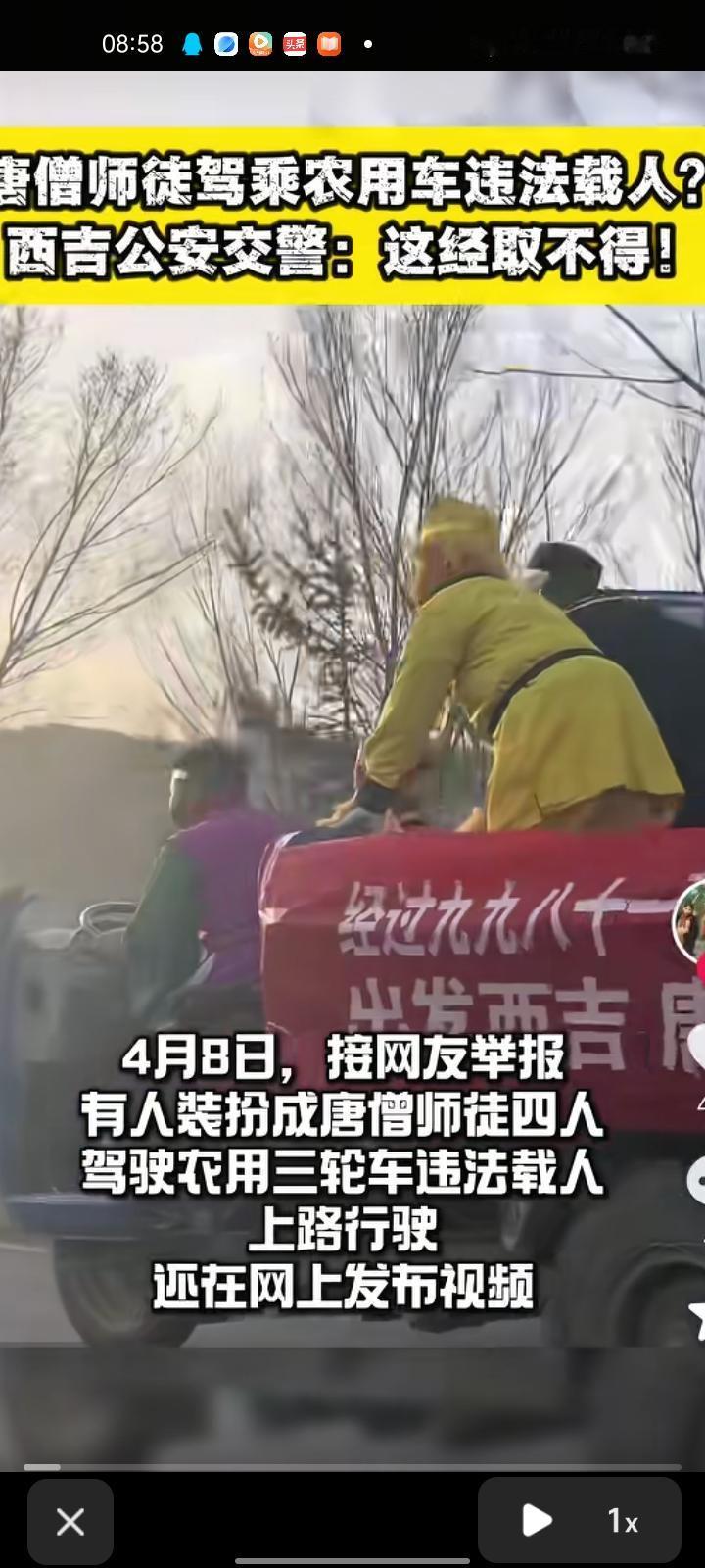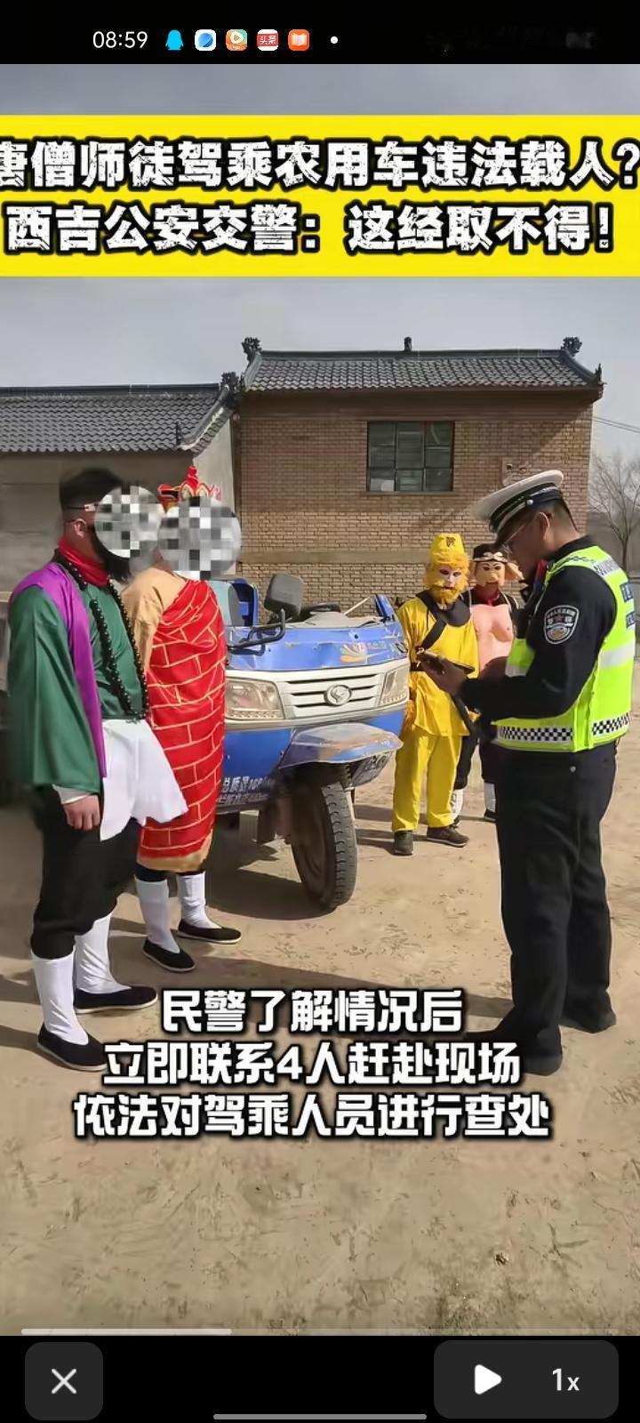 4月8日,固原市西吉县。西吉公安接到网友举报,有人装扮唐僧师徒四人驾驶三轮车违法载人上路行驶,还在网上发布视频(我查到了,叫宁夏西游)。当地民警了解情况后立即联系四人赶赴现场,对驾乘人员进行查处。
