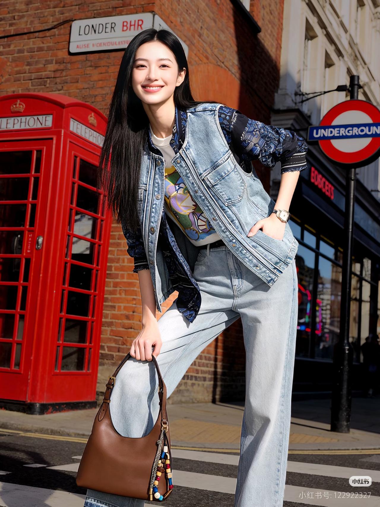 伦敦街头,红电话亭前,时尚少女微笑自拍。