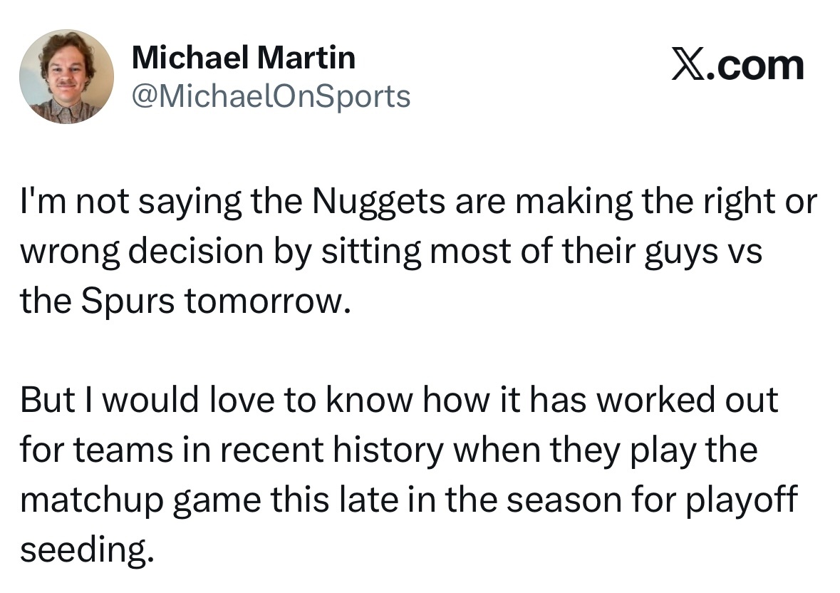 雷霆记者Michael Martin:我并非评判掘金队明日对阵马刺时轮休大部分主力的决定正确与否,只是好奇在近年的NBA中,那些在赛季末为了季后赛排位而刻意打“卡位战”、操纵对阵的球队,最终都取得了怎样的结果。