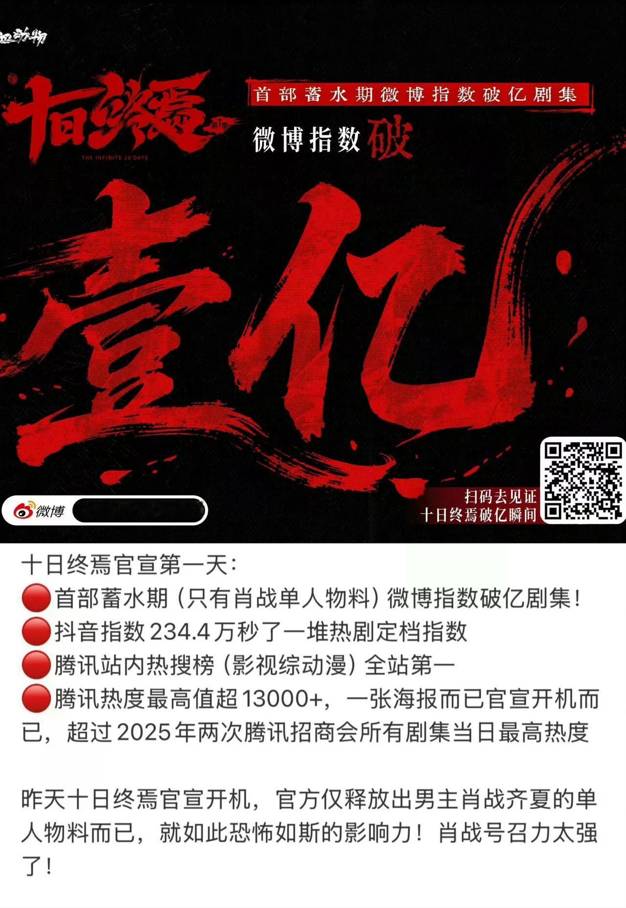 肖战发的十日终焉齐夏概念片播放过亿,两天不到,十日终焉两项破亿,热度比在播剧还高