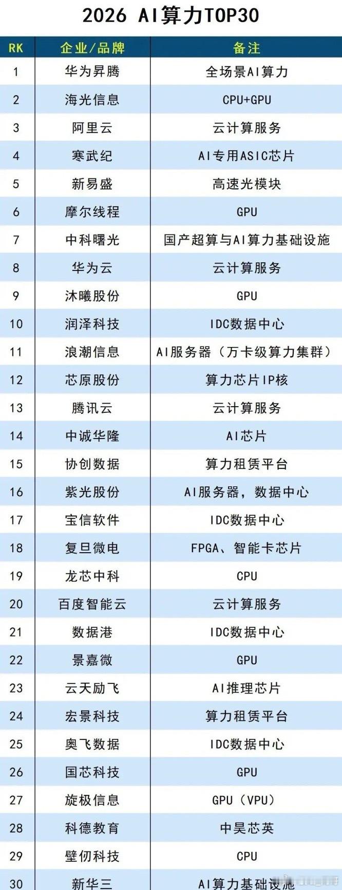 ✅ AI算力全赛道:华为昇腾、海光信息、阿里云领跑TOP30,覆盖芯片、云计算、IDC、算力租赁、光模块等全环节;