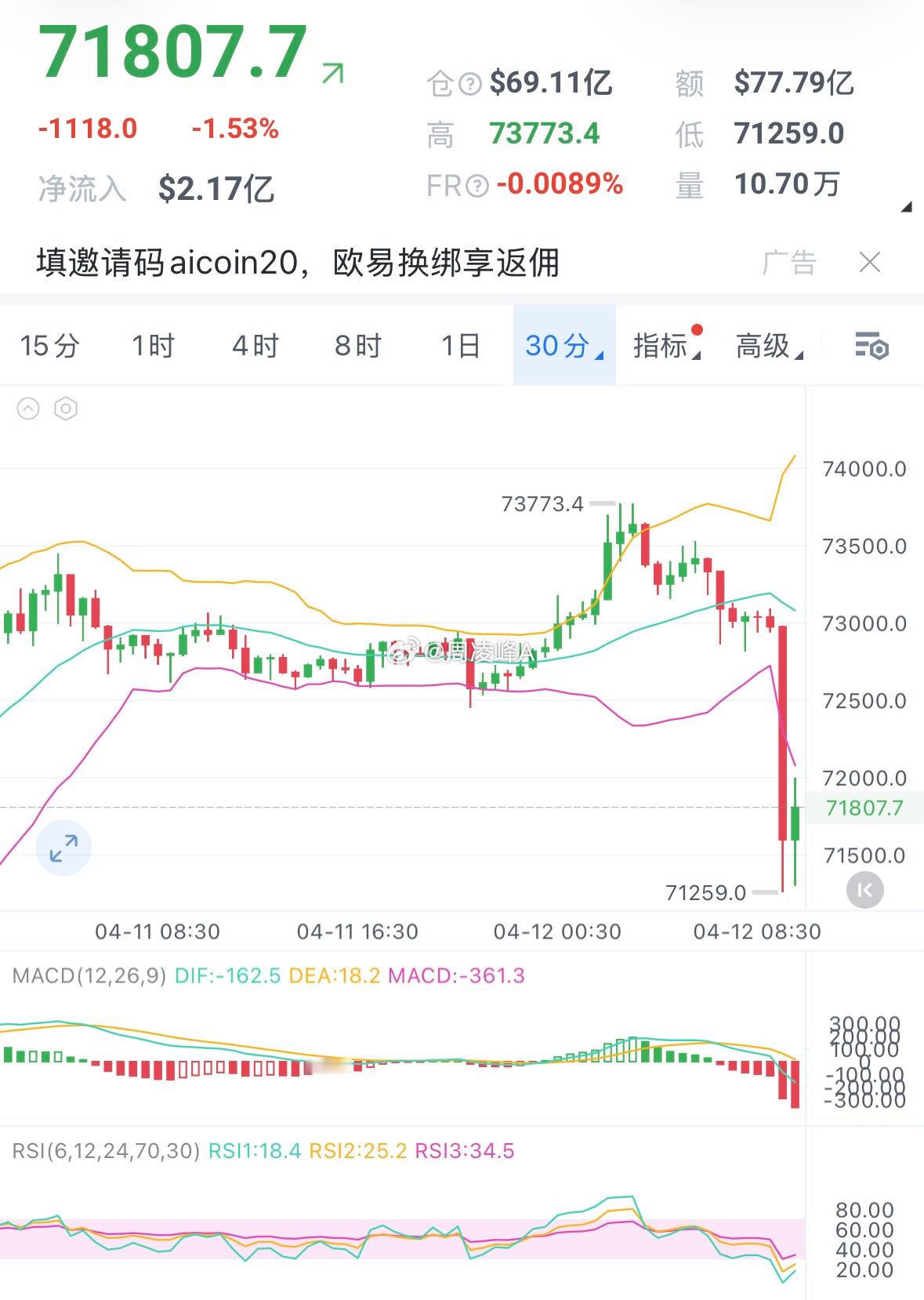比特币4小时级别趋势已经形成,需跌破70000否则会一直有效