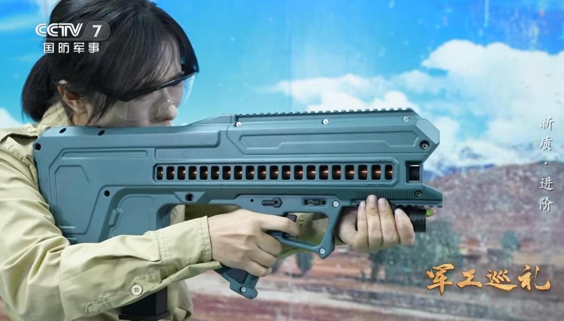 从央视曝光的画面来看,这把枪的颜值也拉满了——外形科幻又简洁,是那种方正的模块化设计,枪管大概30厘米长,重量还特别轻,单手就能轻松持握,枪身上还有个电子显示屏,能实时显示电量、剩余弹量和发射模式,科技感直接拉满。