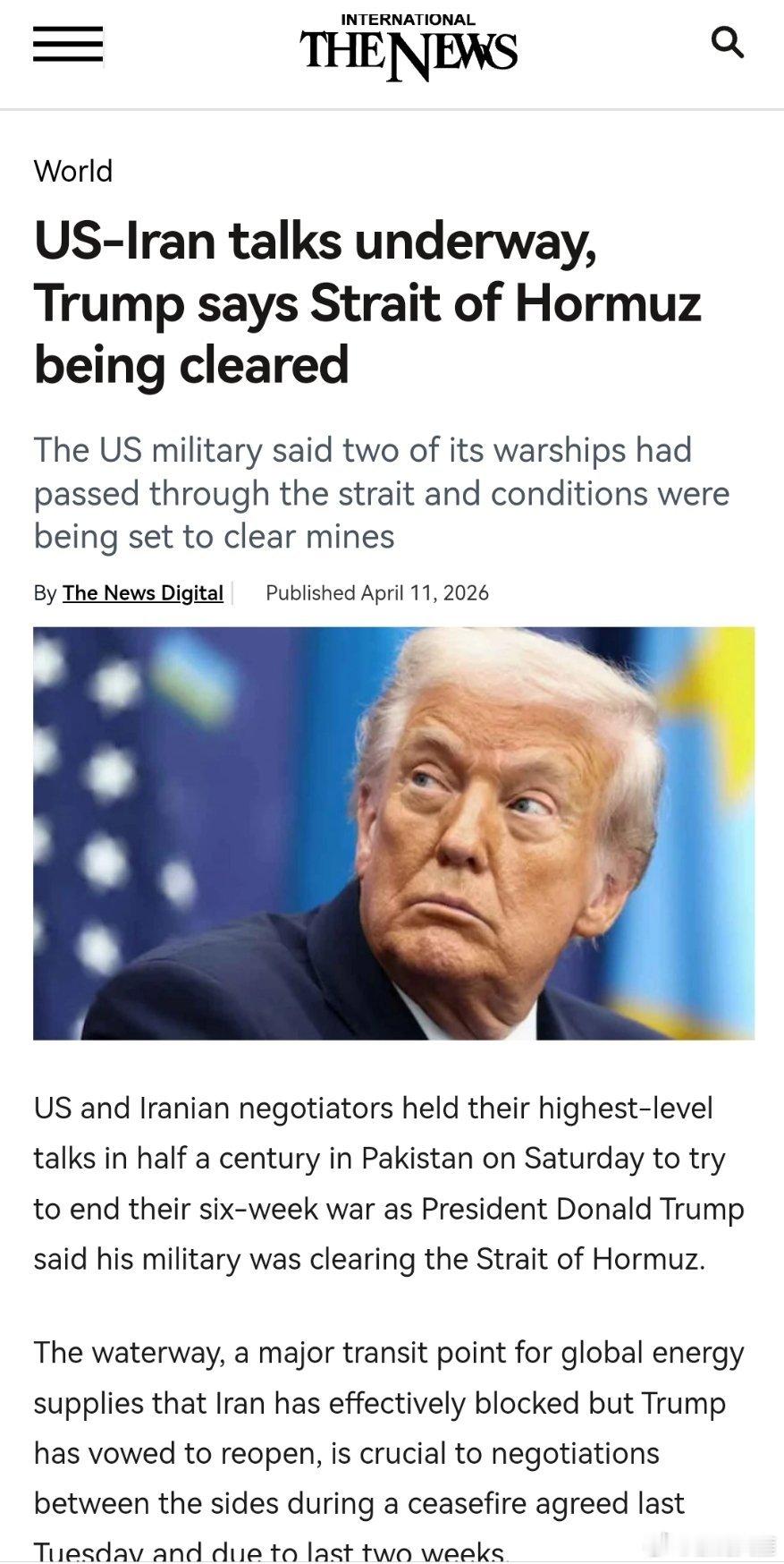 美国军方表示,两艘军舰已通过该海峡,并且正在准备清除水中的水雷。而伊朗官方媒体则否认有任何美国军舰通过了这条航道。在伊斯兰堡举行的会谈是美伊两国十多年来首次举行的直接对话,也是自 1979 年伊斯兰革命以来的最高级别会谈。(巴基斯坦新闻网)