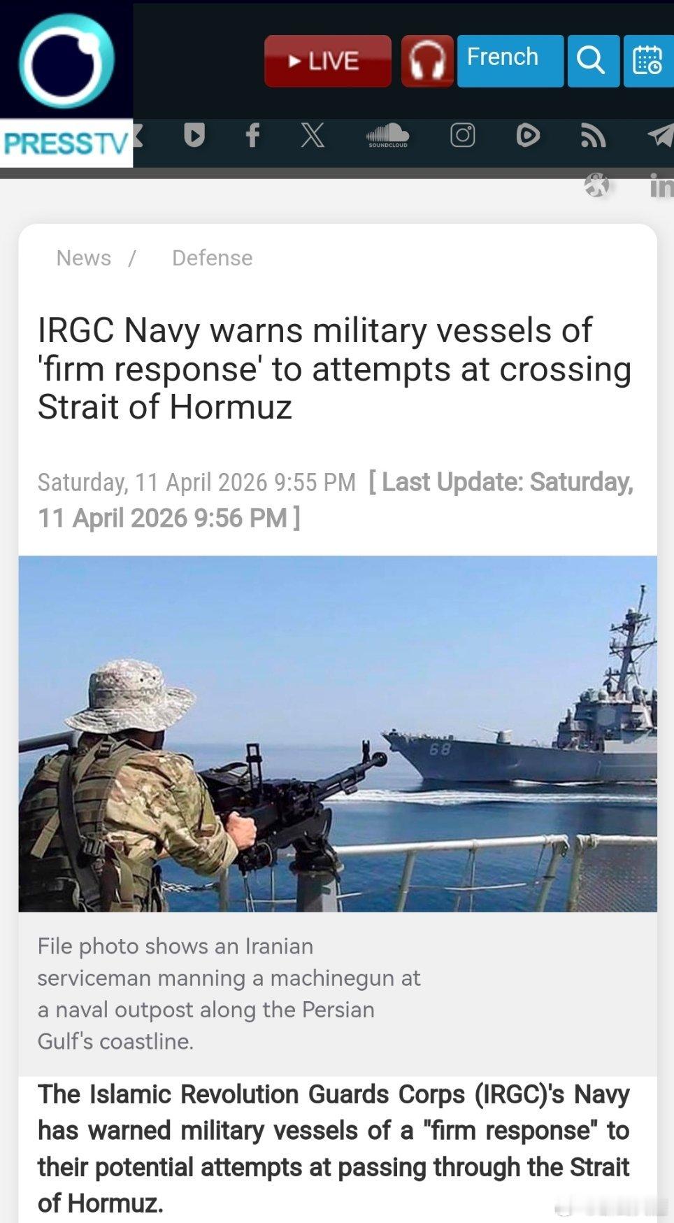 伊斯兰革命卫队海军已发出警告,称若军舰试图通过霍尔木兹海峡,将对其采取“坚决的应对措施”。海军于周六在一份声明中发出了这一警告,声明中称其“对这一重要航道实施了全面且明智的管控”。他指出:“根据相关规定,过境许可仅授予非军用船只。”海军坚决否认有关美国船只通过该海峡的报道,并再次强调,任何此类企图都将遭到“果断有力的回应”。(伊朗新闻电视台)