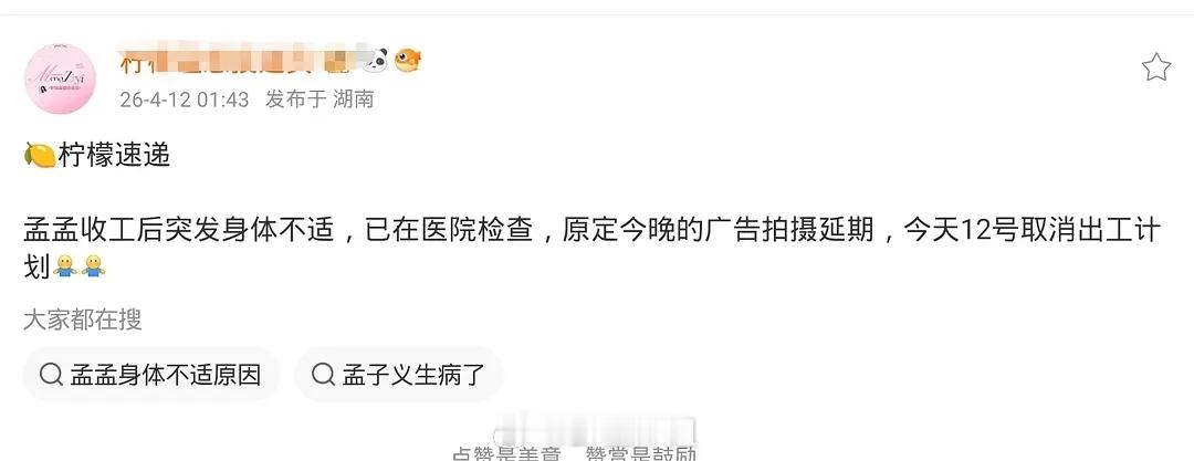 最近好多女艺人生病呀,凌晨孟子义也生病进医院了 前几天还有王楚然 李一桐也突发病情进医院真的感叹咱内🐟女艺人都真的挺努力的 很敬业孟子义突发身体不适