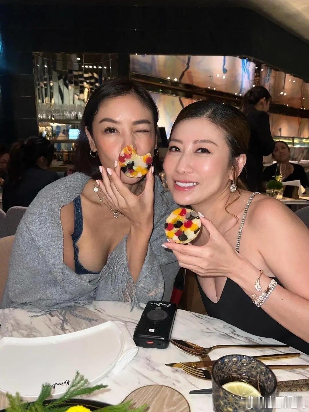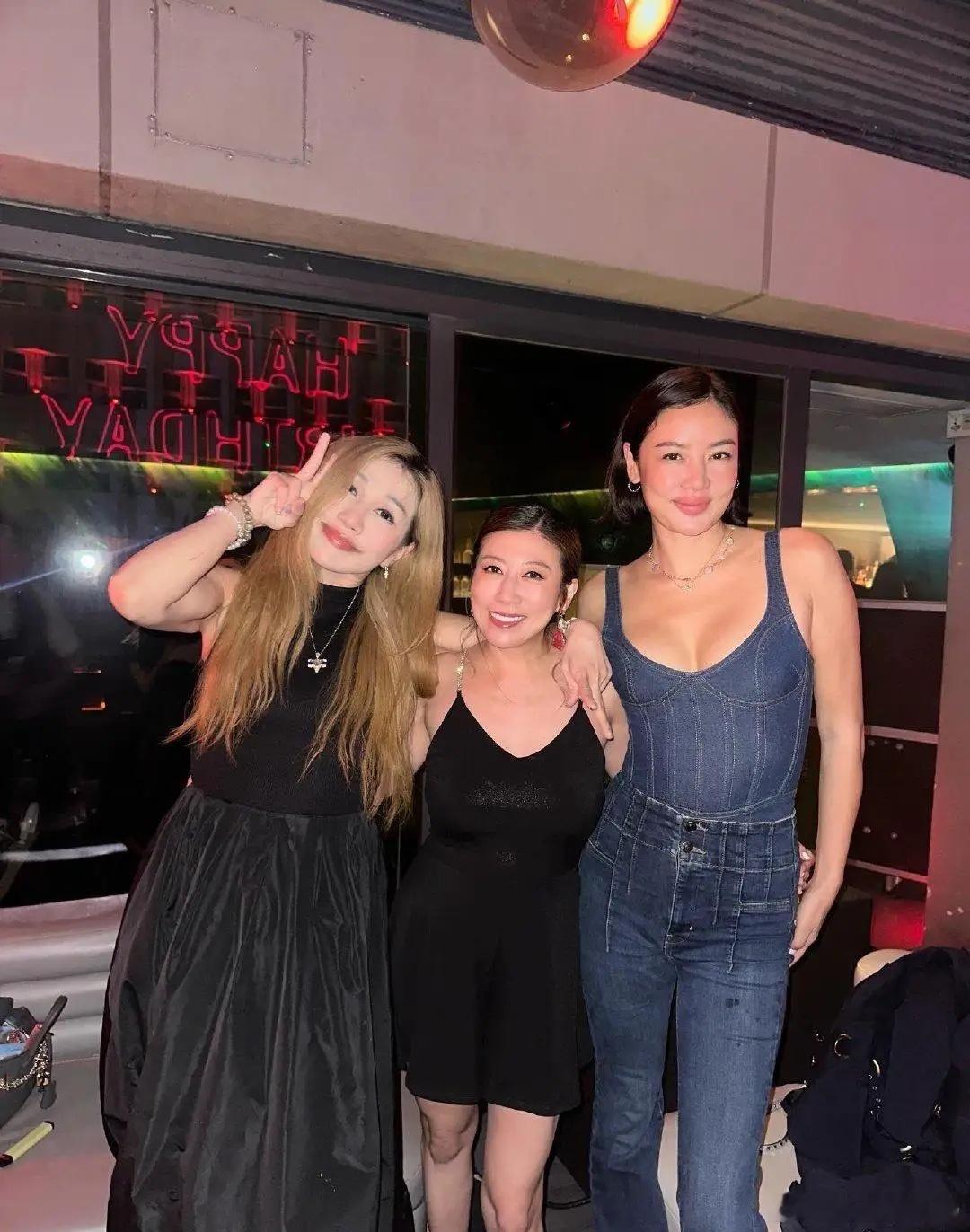 46岁乐基儿和赌王千金何超盈在酒店聚餐,她打扮时尚微性感,她身穿低胸吊带衫配牛仔