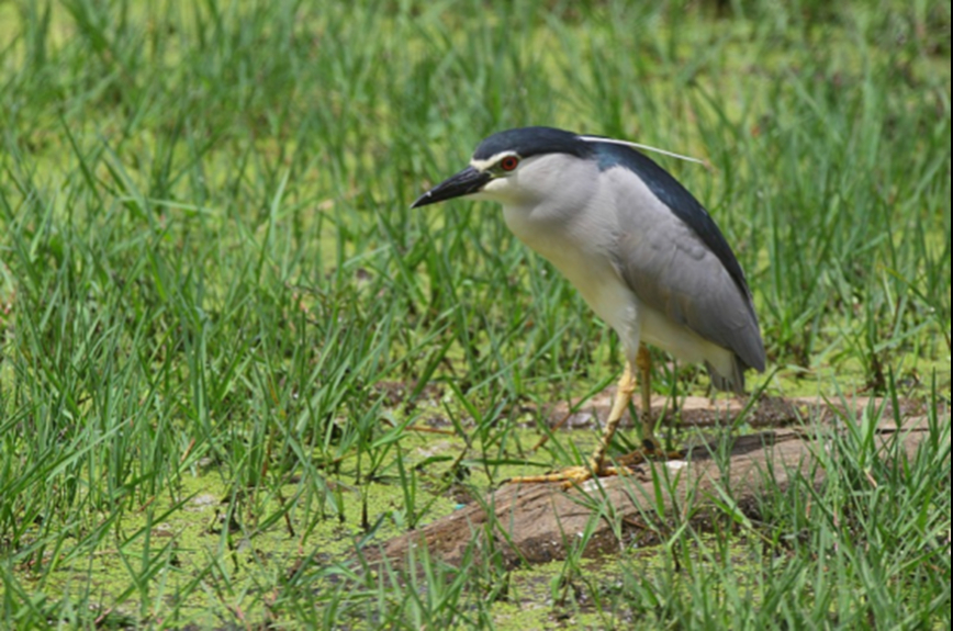 夜游鹤,别名夜鹤,红眼、枕部有白色长饰羽,夜行性,栖息于水边,以鱼虾为食,属于国家“三有”保护动物,受法律保护。