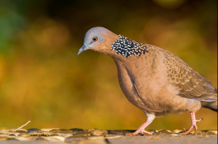 斑鸠,俗称野鸽子,颈侧有黑底白点“珍珠领”,叫声低沉,是城乡常见鸟类,属国家“三有”保护动物,以植物种子为食,维系生态平衡,禁止猎捕。