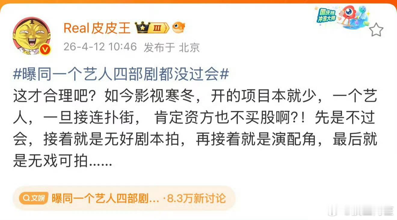 其实顶多走到没有好剧本拍这一步自诩顶流过的人是不会甘心演配角的,因为这就是承认自己flop了,所以顶多是一直拍烂剧,一直氵数据,一直碰瓷别人。反正执行这些操作又不需要真人,只需要电量。