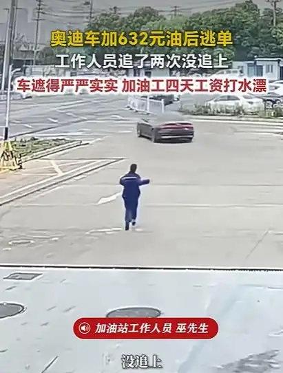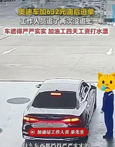 奥迪逃单加油站员工垫付4天工资4月11日,安徽合肥,一辆奥迪车加632元油后逃单,工作人员追了两次没追上。加油站工作人员巫先生称,那个车子完全就是黑的,感觉是故意的,挡得严严实实,已经报警了。加油员追了2次没追上,632元是她自己付的,等于她四天的工资打水漂。