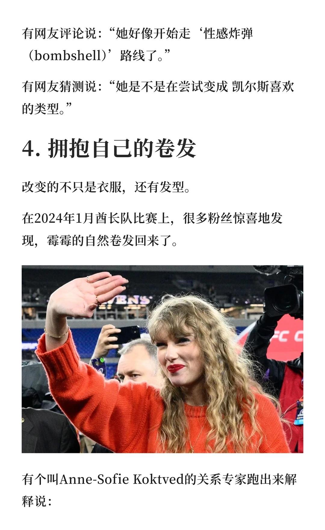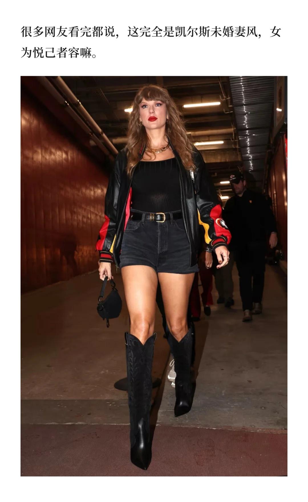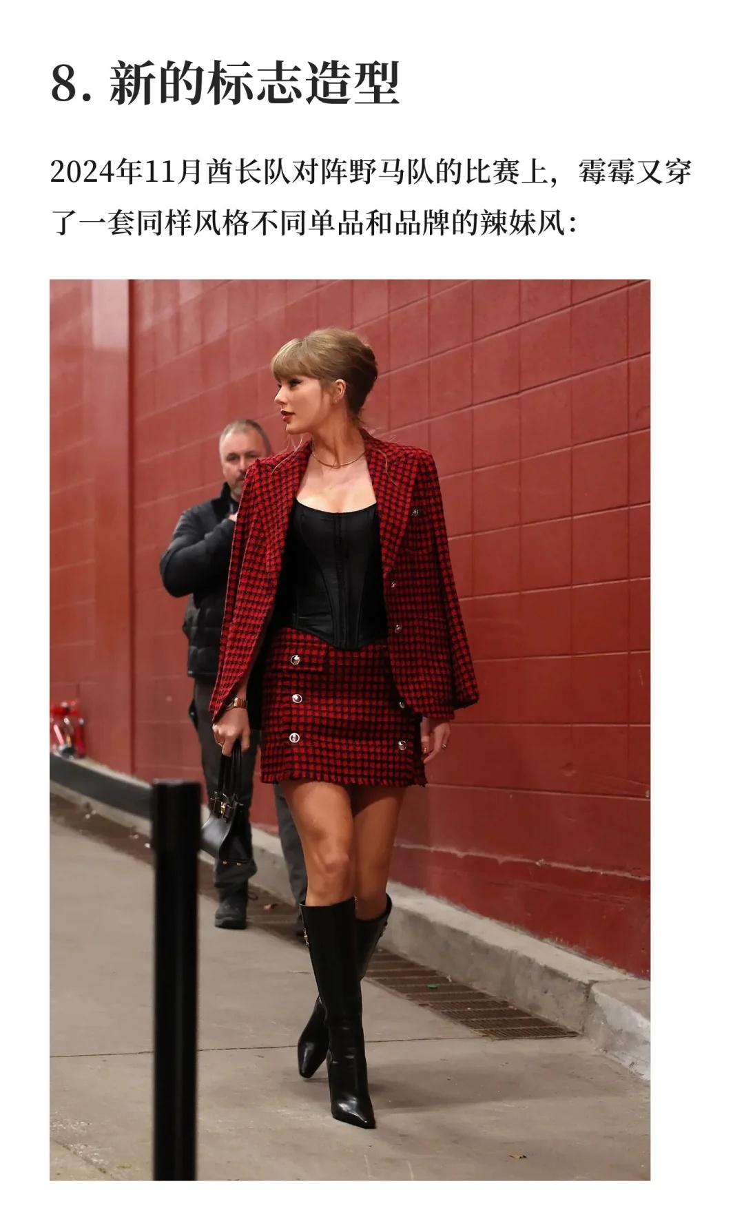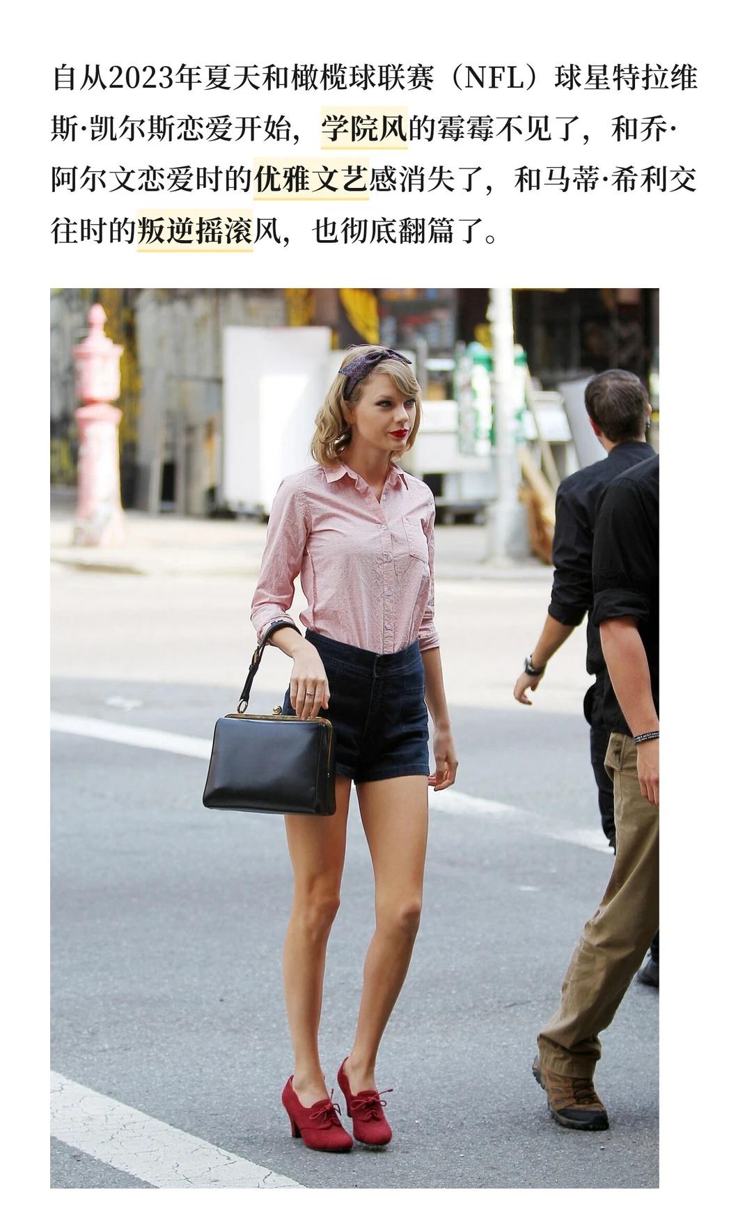 自从2023年夏天和橄榄球联赛(NFL)球星特拉维斯·凯尔斯恋爱开始,学院风的霉霉不见了,和乔·阿尔文恋爱时的优雅文艺感消失了,和马蒂·希利交往时的叛逆摇滚风,也彻底翻篇了。