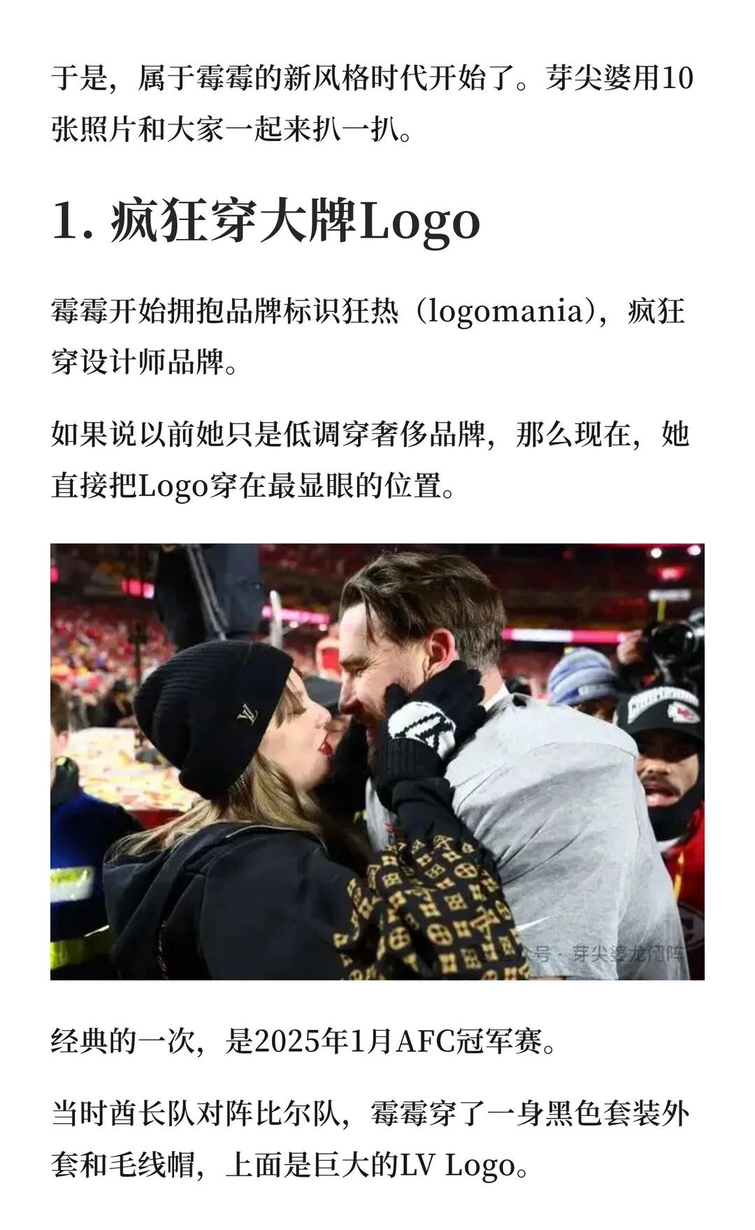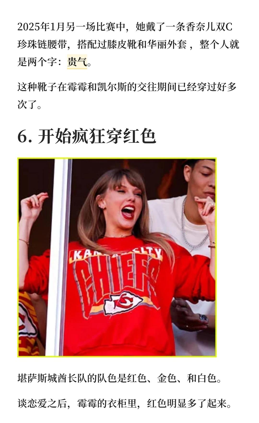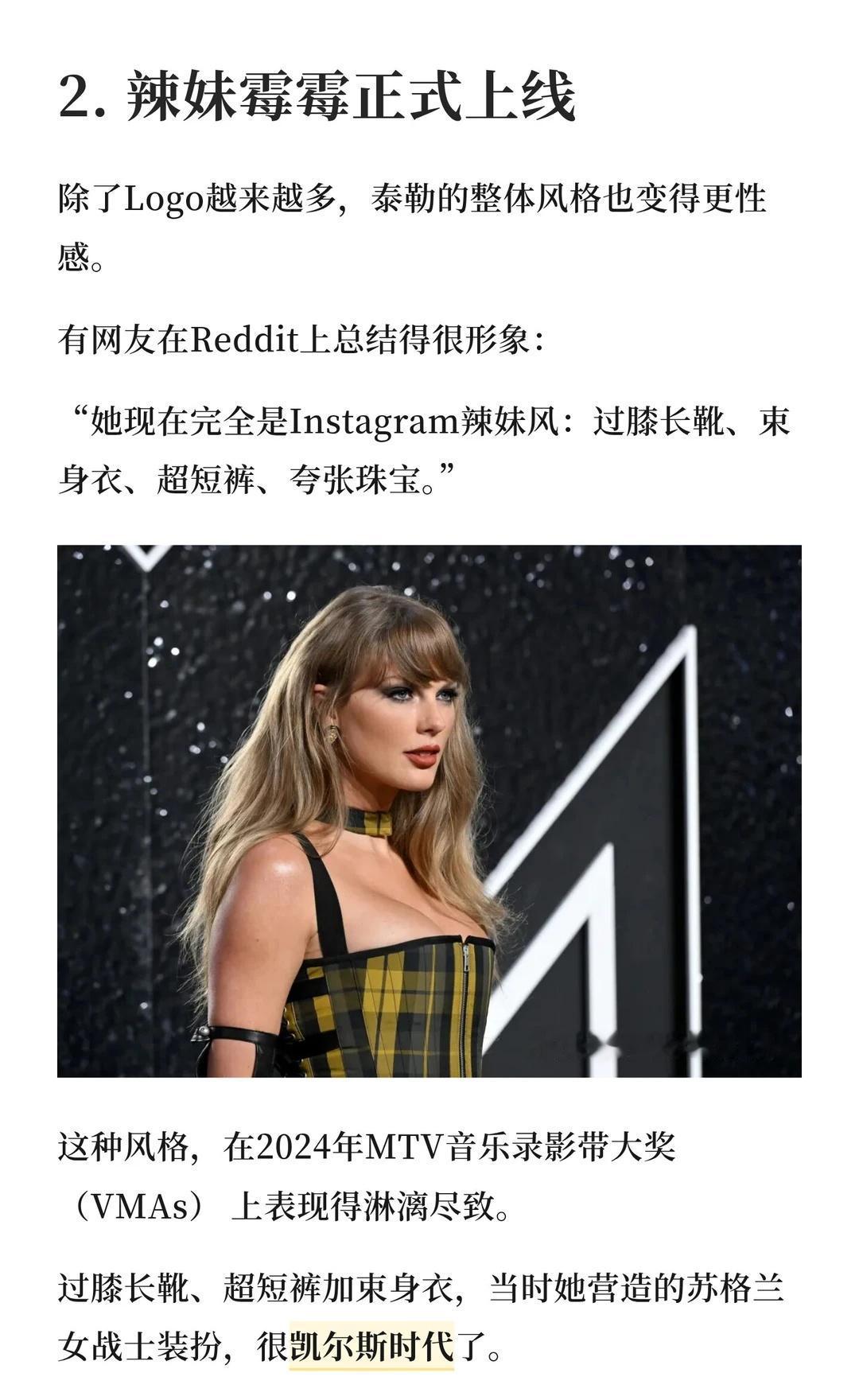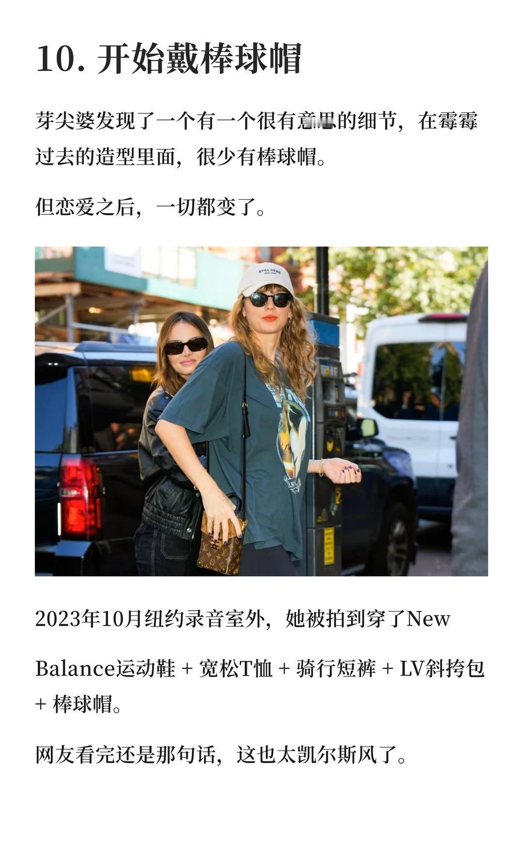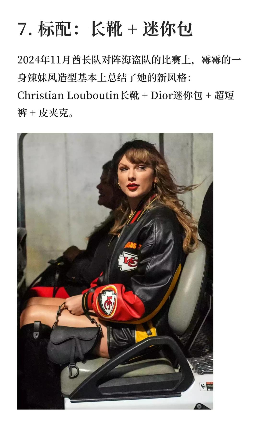 自从2023年夏天和橄榄球联赛(NFL)球星特拉维斯·凯尔斯恋爱开始,学院风的霉霉不见了,和乔·阿尔文恋爱时的优雅文艺感消失了,和马蒂·希利交往时的叛逆摇滚风,也彻底翻篇了。