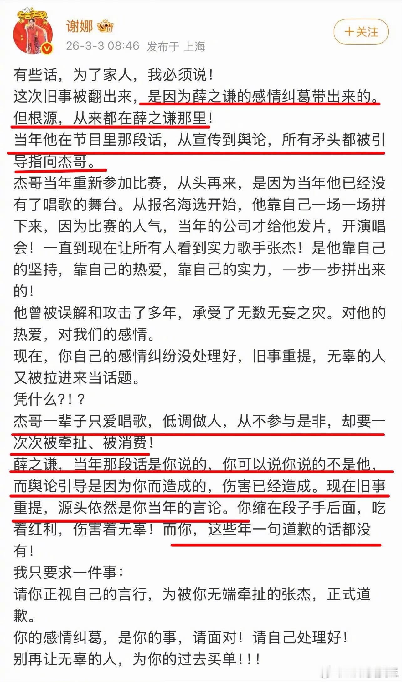 从去年开始,谢娜先是各种亮相张杰演唱会担任嘉宾,各种同台热舞;接着,又引发张杰在唯粉与谢娜之间,选择当众维护谢娜;随后,又突然在微博发长文公开喊话薛之谦,认为薛之谦次次消费张杰,要求薛之谦道歉;再接着又上浪姐,在节目热度最高的时候,官宣即将举办个人演唱会;最后,又火速表示将继续使用张杰的演唱会团队……