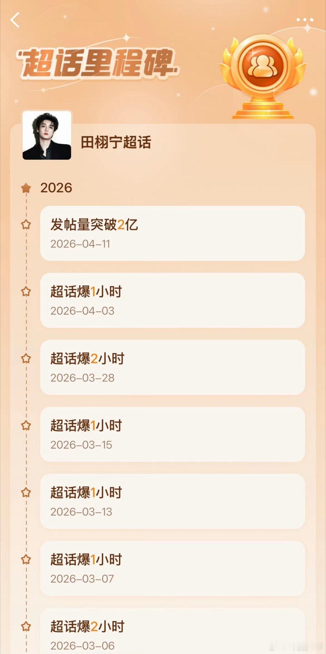 田栩宁超话发帖量破2亿了田栩宁超话发帖量 从1亿到2亿,田栩宁只用不到四个月!超话发帖量再创佳绩,每一条都是偏爱与支持,顶流热度稳稳拿捏!
