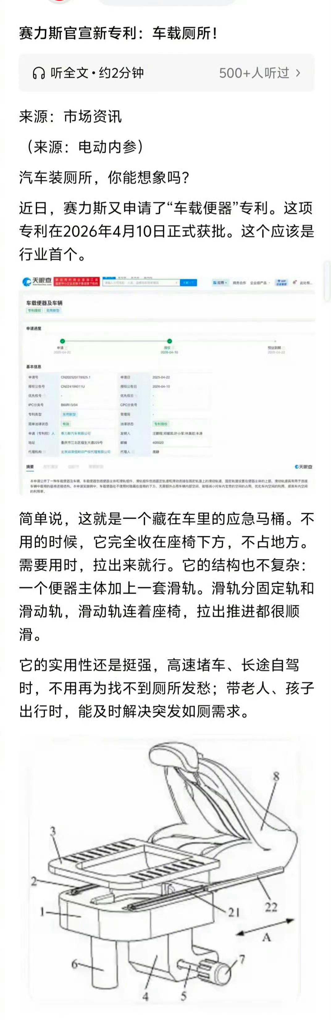 ??? 赛力斯申请车载厕所专利、希望是防御性注册、不过也有特殊人群会用到这个功能
