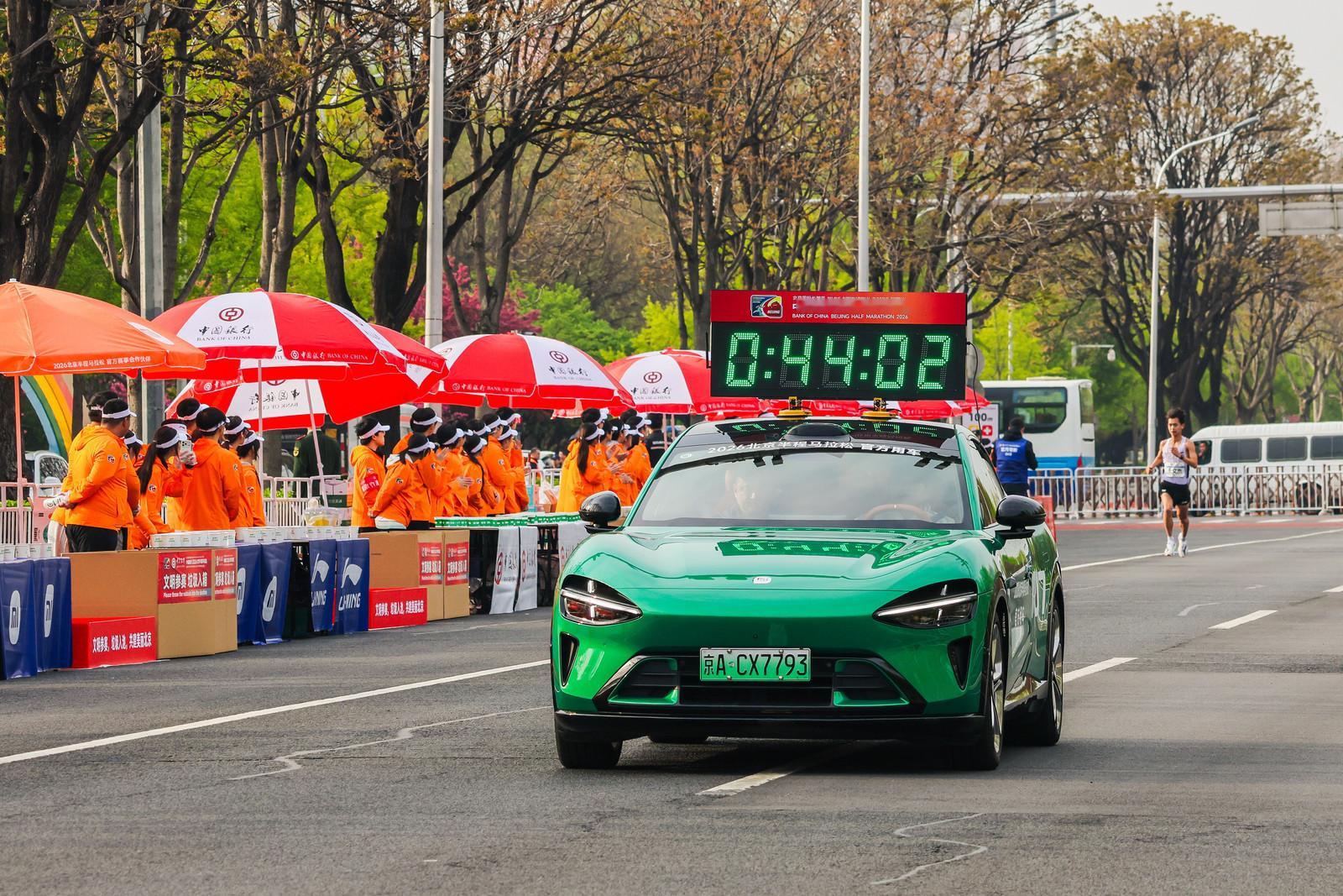 今天的北京半程马拉松官方用车是小米 YU7 啊计时头车是两辆绿色的 YU7,还挺