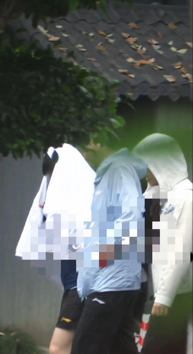 雨里赶路的样子,像个把自己裹得严严实实的小朋友,身边跟着邱导和翔哥,队医有说有笑,朝着训练场走。