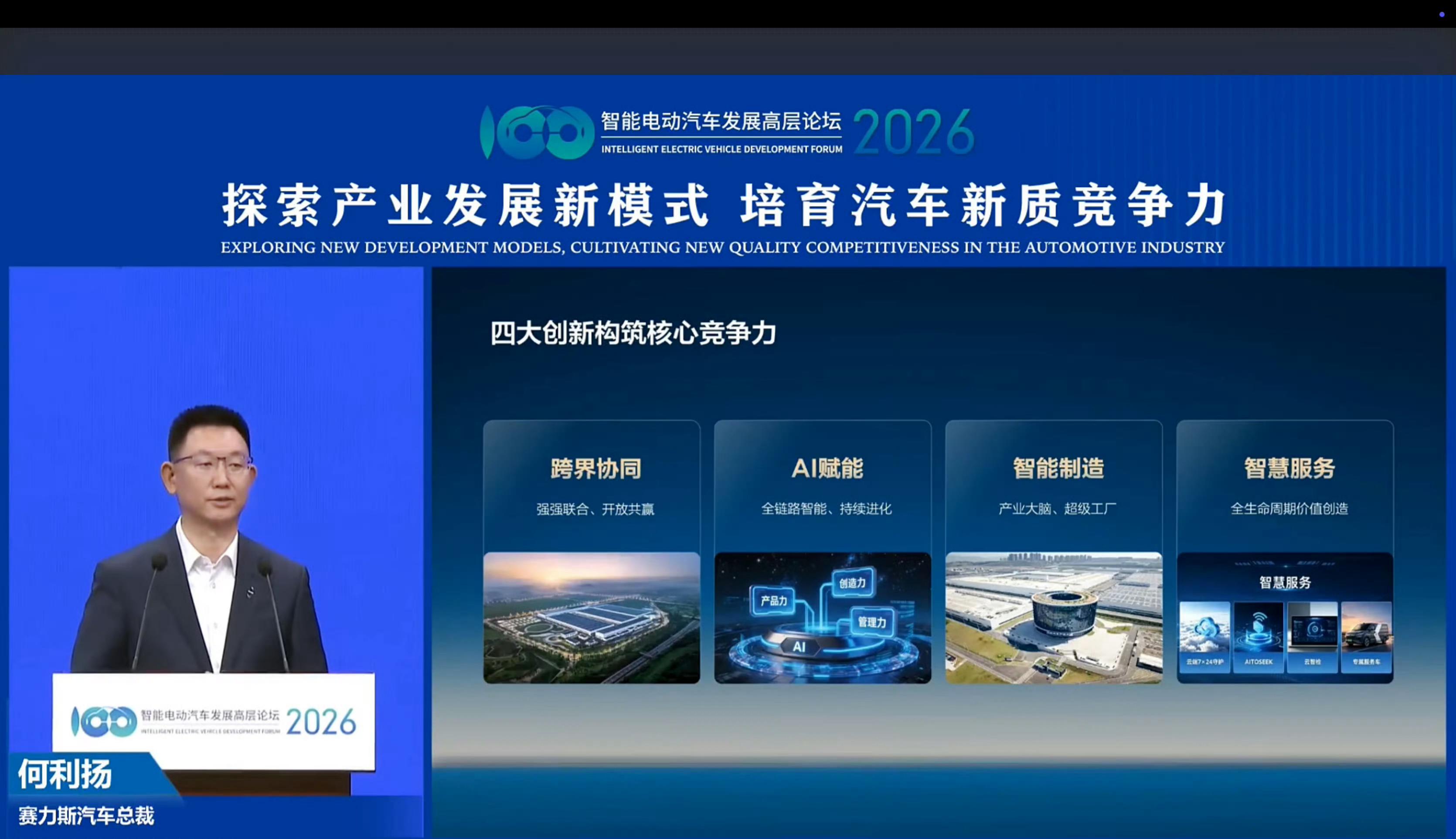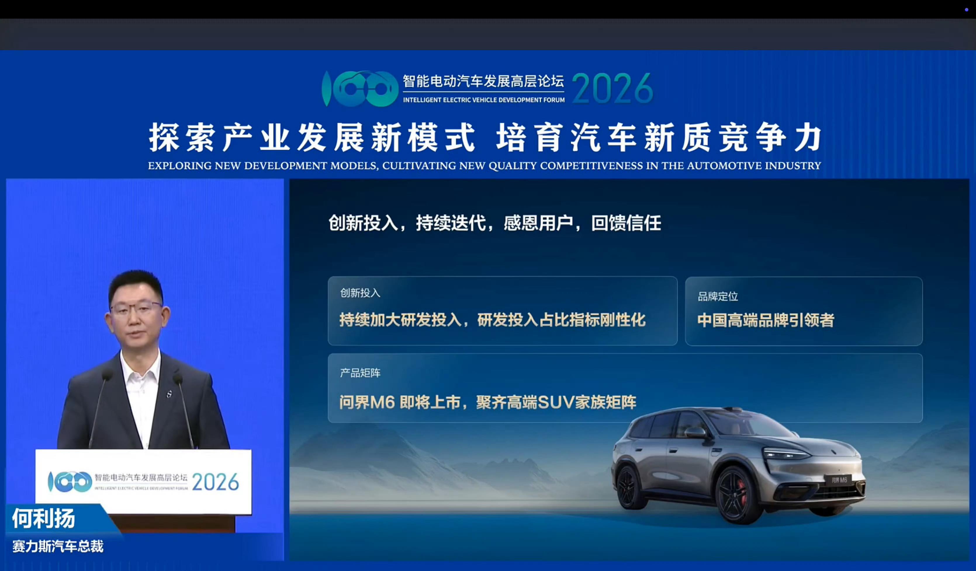 2026智能电动汽车发展高层论坛在北京召开,聚焦新能源汽车“四化”发展,赛力斯汽车总裁何利扬分享问界成绩与行业思考。他表示,汽车技术迭代飞速,平衡迭代速度与品质、兼顾新老用户体验是核心课题,赛力斯始终坚持让所有用户都享有高品质服务与高价值体验。
