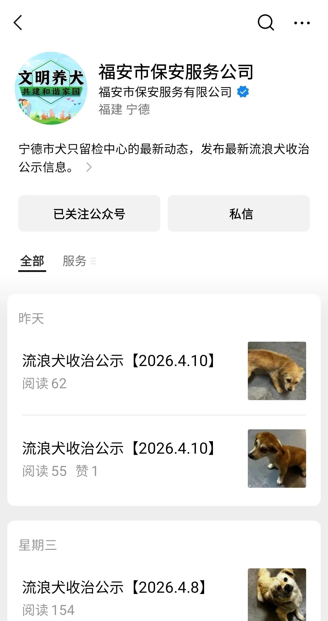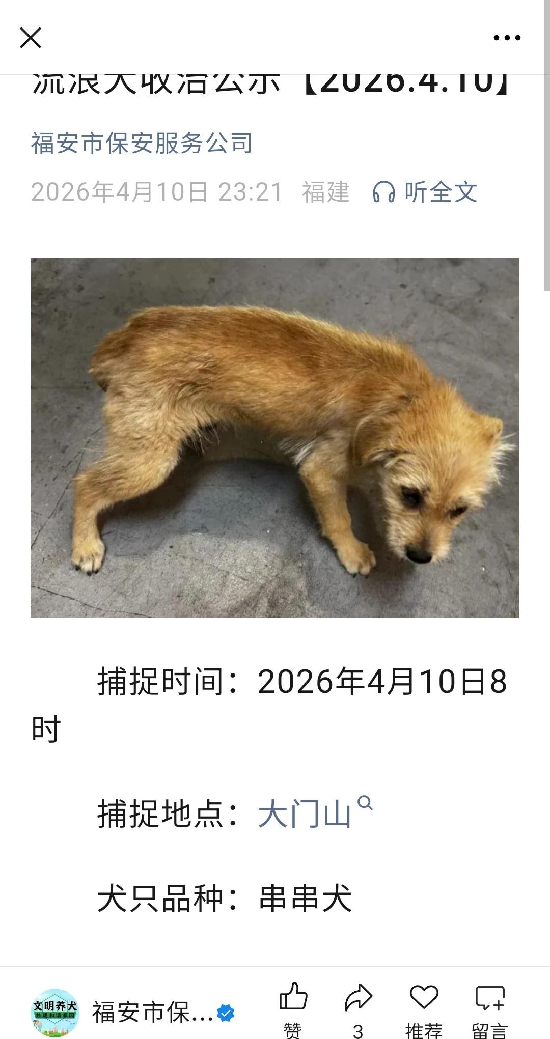 转自微信福安市保安服务公司,宁德市犬留所抓捕狗狗的公示, 狗狗主人看到速去领回。不然狗狗送去犬留所就没有希望了。当地人关注宁德市犬只收容公示号福安市保安服务公司