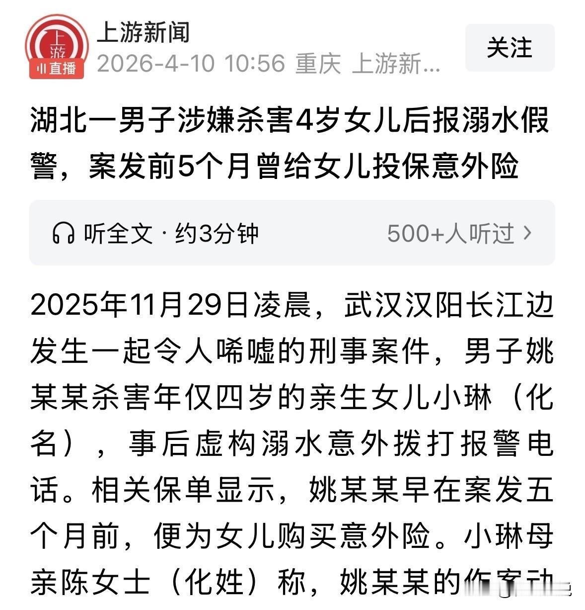 湖北武汉,男子夜里把4岁女儿带到江边,将女儿头摁入江水中,确定女儿没气后,他把女儿抛进江里,报警说女儿意外溺水了,在外地的妻子得知女儿的死讯后,崩溃不已,她总觉得事情没那么简单,而警方调查后发现,男子在事发5个月前,曾为女儿购买了意外险。