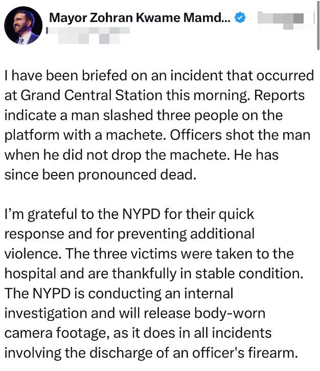市长佐兰·马姆达尼在一份声明中感谢纽约警察局的“快速反应,并阻止了更多暴力事件的发生”。