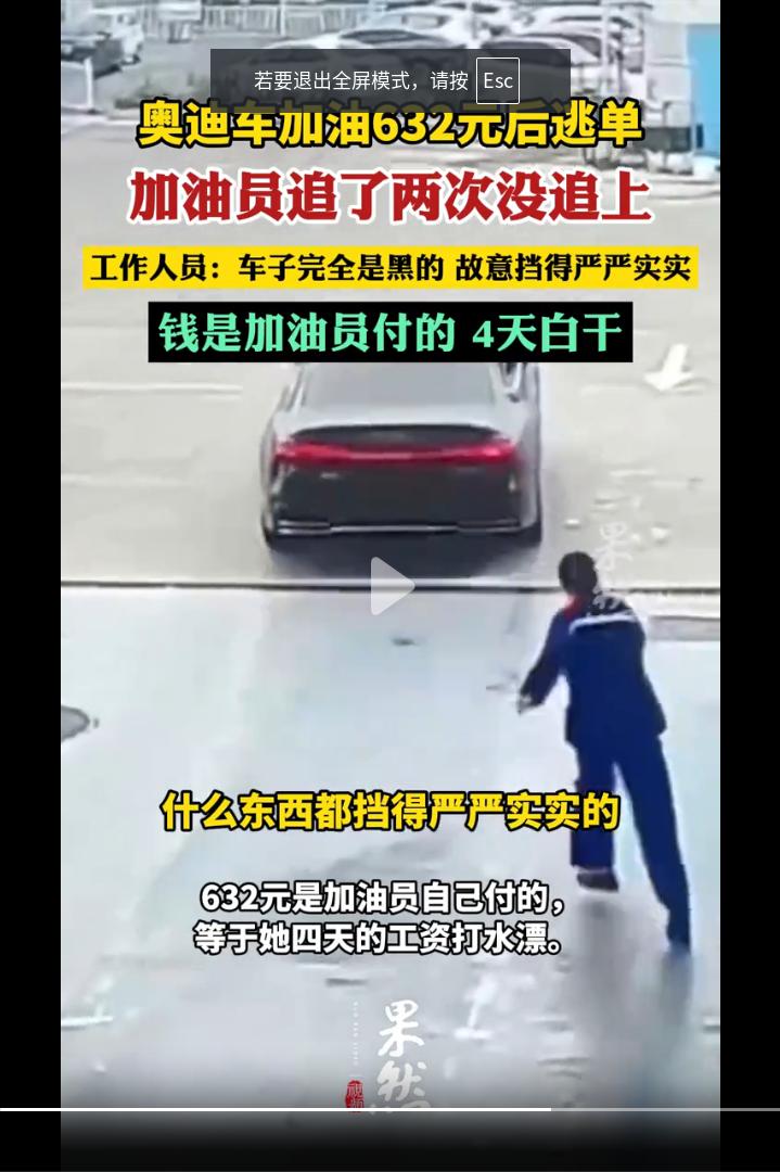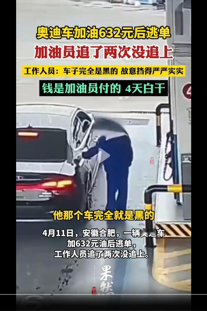 安徽合肥,一辆黑色奥迪轿车加满油后开车逃单,加油员追了两次也没有停车,600多元油费由加油员承担。加油员:就是故意的来的时候遮的严严实实的,4天白干了!