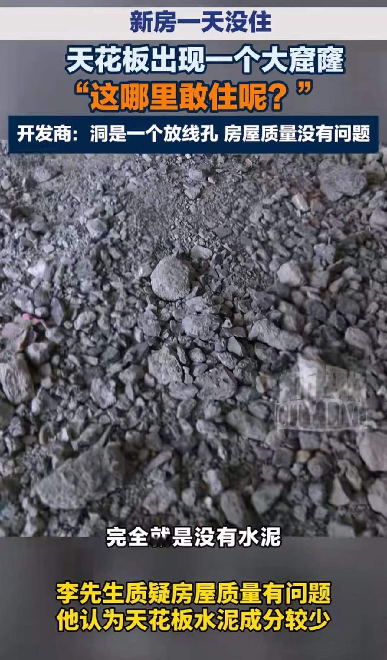 江西南昌,新房一天没住,天花板出现一个大窟窿,男子子哭诉:“这我哪里敢住?完全没有水泥!”开发商神回复:“洞是一个放线孔,房屋质量没有问题 !”网友:事实摆在面前,还敢这样说话,了不起!