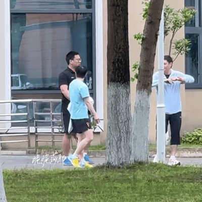 4.12日,莎莎结束体能训练,抱着毛巾衣服和coco翔哥一起回来。