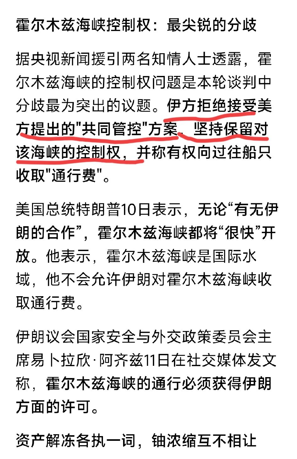伊朗拒绝接受美方提出的"共同管控"方案,坚持保留对该海峡的控制权,并称有权向过往船只收取"通行费"。而特朗普则表示,无论“有无伊朗的合作”,霍尔木兹海峡都将“很快”开放。霍尔木兹海峡是国际水域,他不会允许伊朗对霍尔木兹海峡收取通行费。